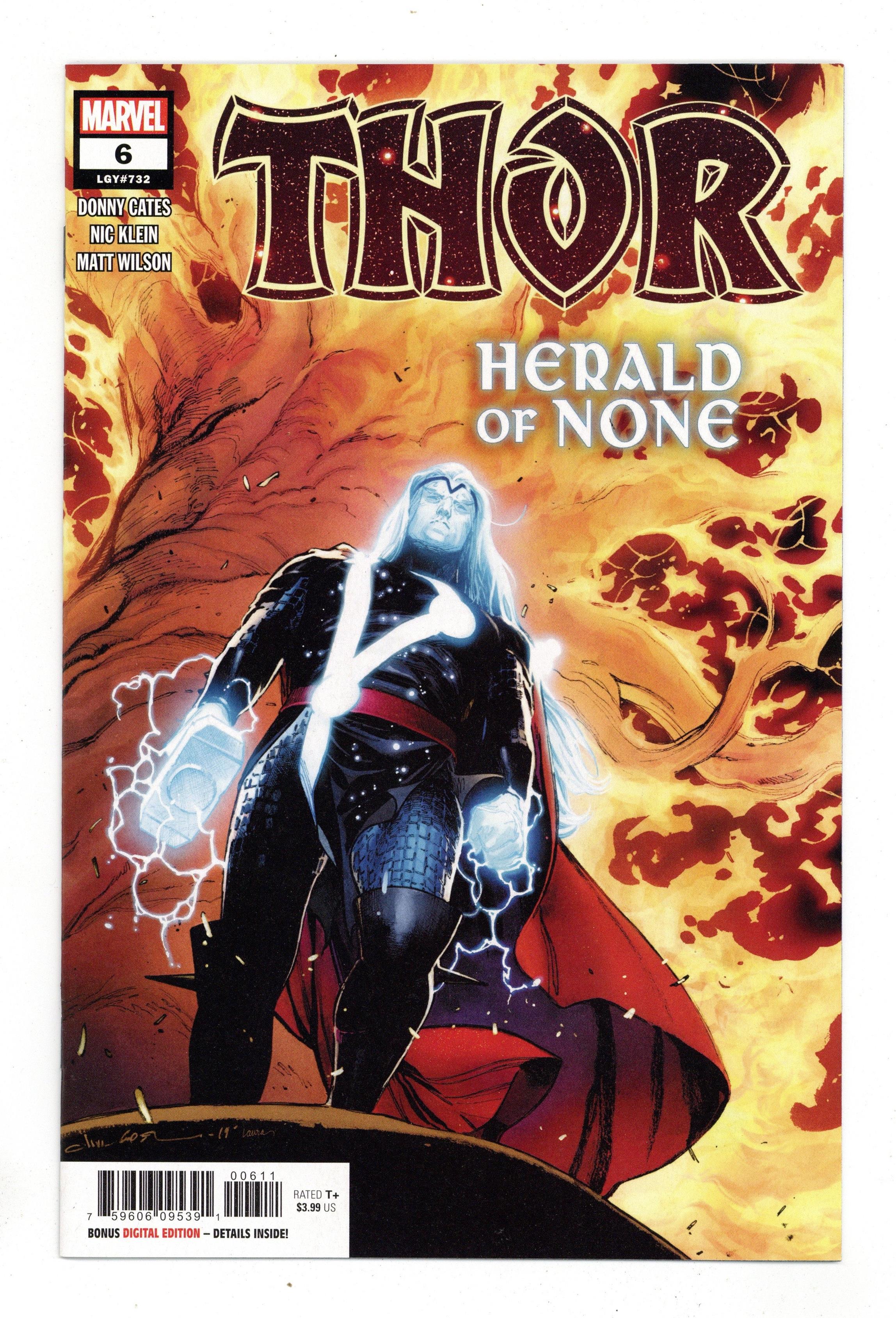 $5.00The Devourer King: Part 6 of 6 - Written by Donny Cates. Art by Nic Klein. Cover by Olivier Coipel. THE DEATH OF KING THOR! The Black Winter has the power to reveal the means of any person's demise - and if the vision is true, Asgard is going to need a new Odinson to take the throne! But Thor is no mere herald or king - and even the death of all existence should fear his coming wrath. 28 pages, full color. Rated T+ Cover price $3.99.