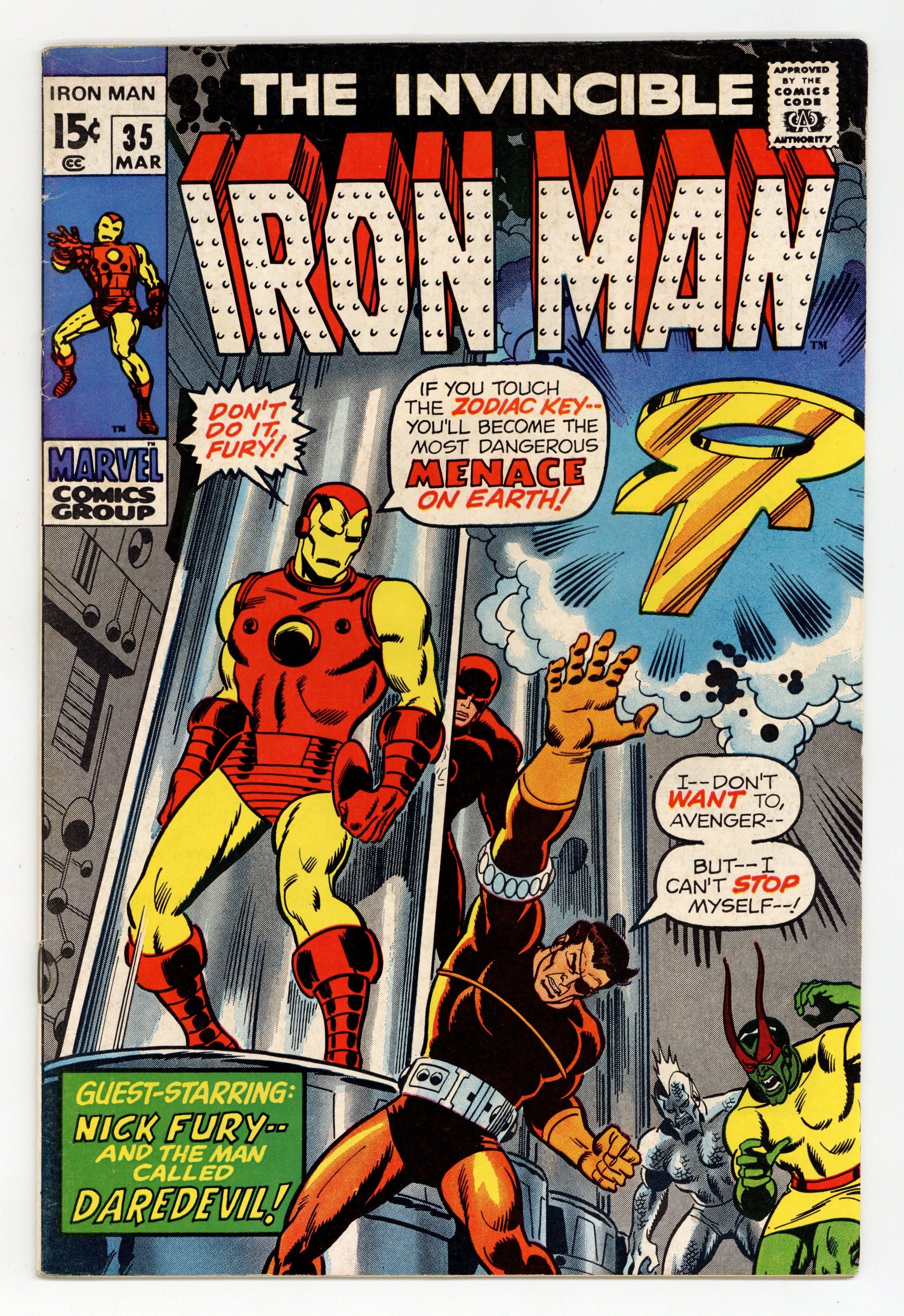 $12.50"Revenge!" Guest-starring Daredevil and Nick Fury. Story by Gerry Conway. Art by Don Heck and Mike Esposito. Cover by Sal Buscema. It's a great battle issue as Iron Man and Nick Fury team up to fight the Zodiac, while Daredevil and Madame Masque join forces to battle Spymaster! Why does everyone want the Zodiac key? The story continues in Daredevil 73. 32 pages Cover price $0.15.