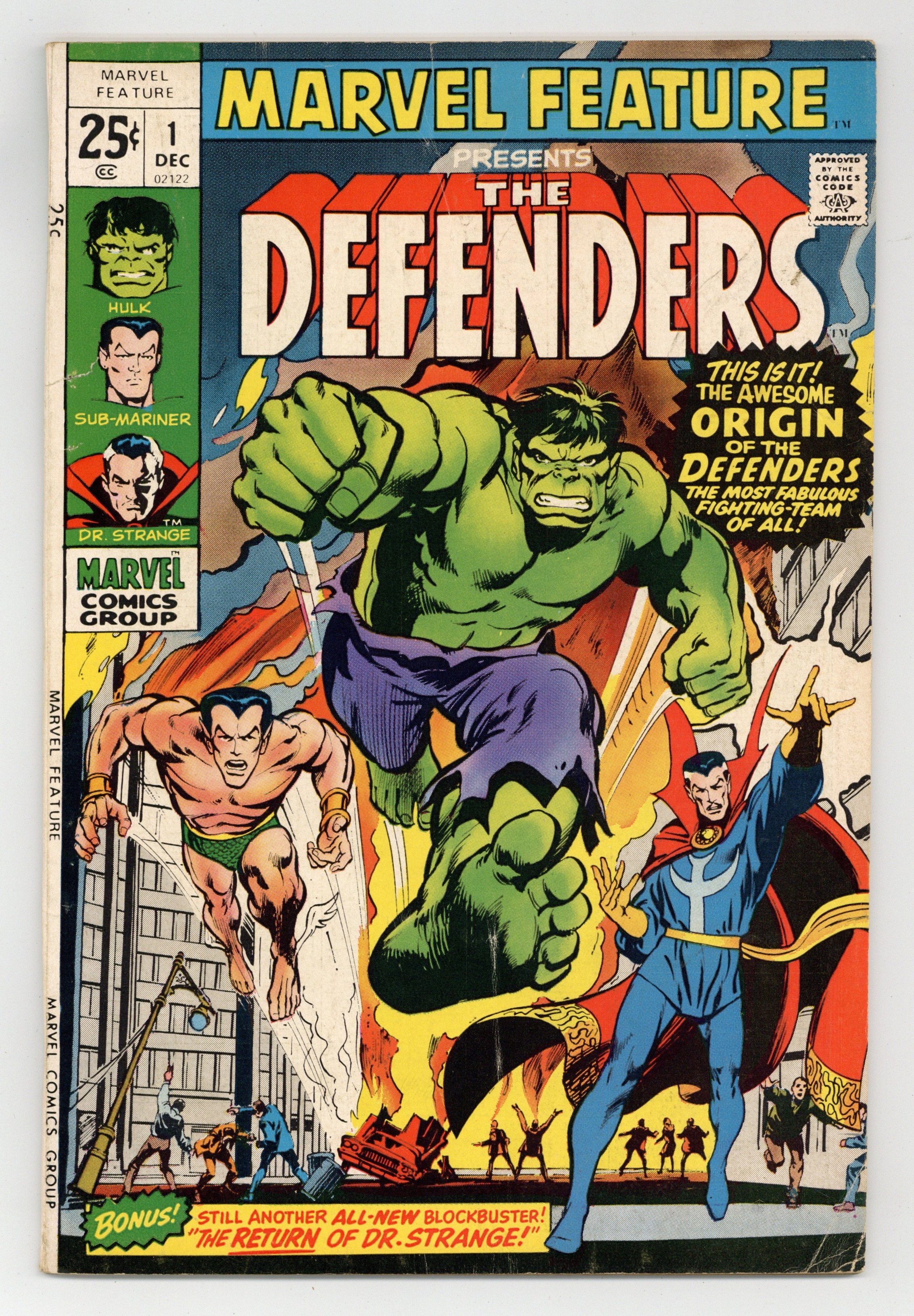 Giant-size issue; 1st appearance and origin of the Defenders (featuring Sub-Mariner, Hulk, and Doctor Strange). Cover by Neal Adams. "The Day of the Defenders!," script by Roy Thomas, pencils by Ross Andru, inks by Bill Everett; The Defenders must stop Yandroth from destroying the Earth with the Omegatron. "The Sub-Mariner and the Icebergs" featuring Namora, Tha-Korr, and Byrrah, script and art by Bill Everett. "The Return!," script by Roy Thomas, pencils by Don Heck, inks by Frank Giacoia; Stephen Strange becomes Doctor Strange again to stop Baron Mordo. 52 pgs., full color. $0.25. Cover price $0.25.
