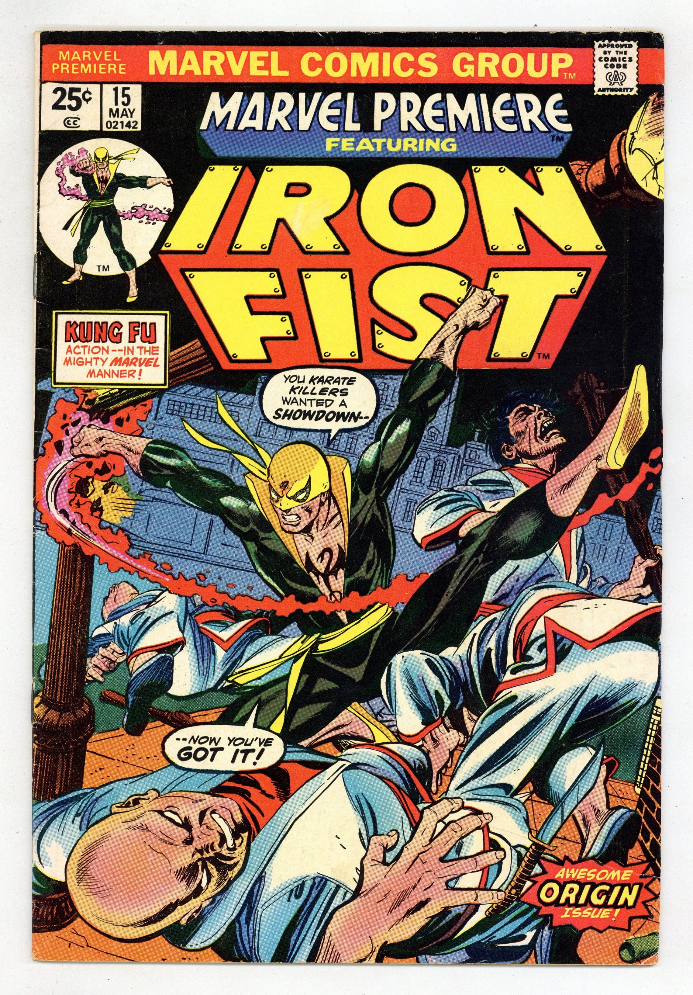 First 25-cent cover price. Origin and first appearance of Iron Fist in The Fury of Iron Fist!, script by Roy Thomas, pencils by Gil Kane, inks by Dick Giordano; Iron Fist passes the final tests in his K'un-Lun training and is granted the privilege of immortality if he so chooses; During his final battle with the robot Shu-Hu, Danny remembers how his father was killed by Meachum and his mother gave her life to save his as the Rand family searched for the fabled city of K'un-Lun. The letters page contains Marvel Value Stamp series A # 94 (Electro by Steve Ditko). Text article explaining price hike to 25 cents for Marvel's 36-page comics, followed by short editorial by Roy Thomas detailing genesis of Iron Fist. 36 pgs. $0.25. Cover price $0.25.