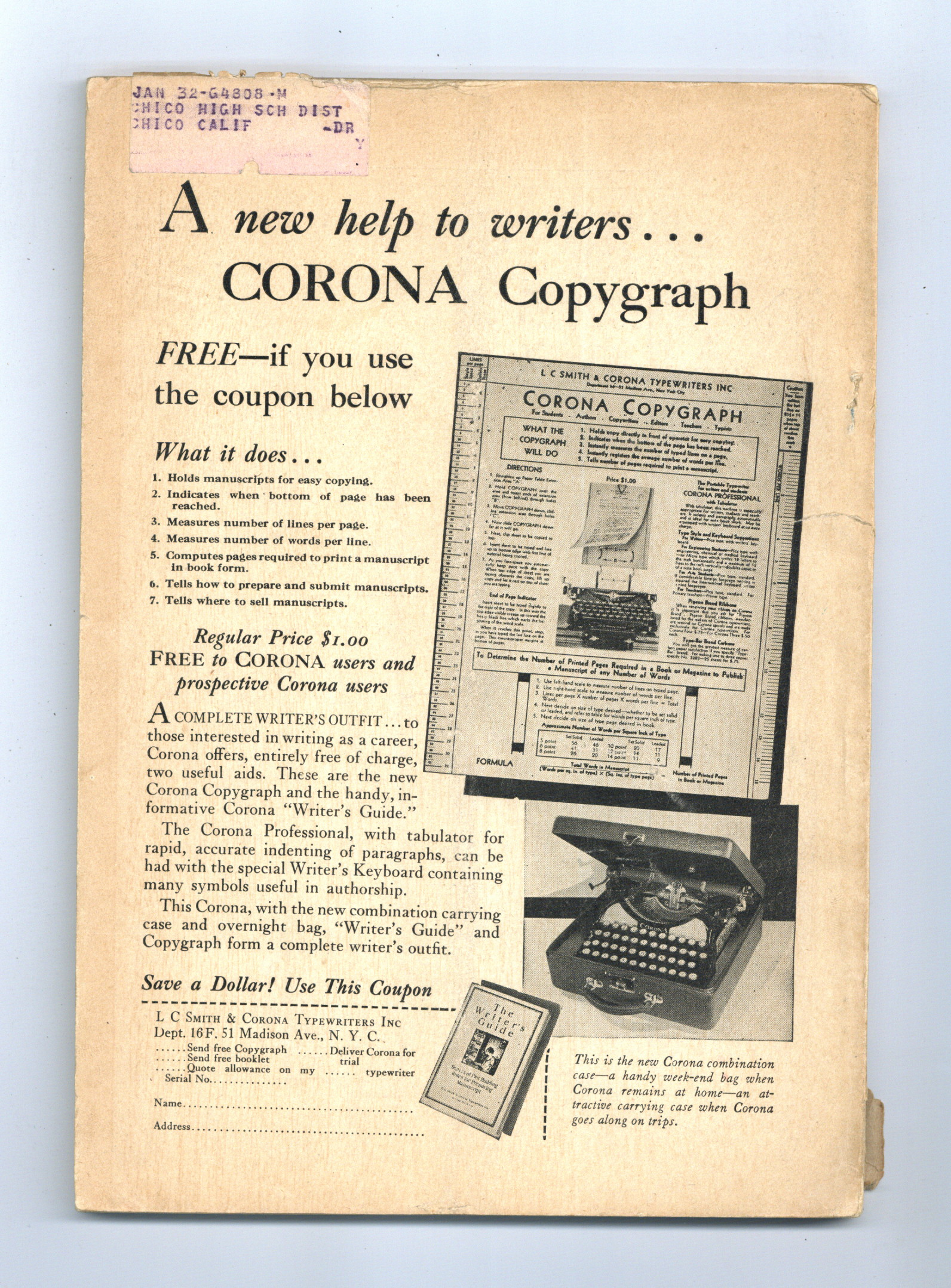 Published Aug 1931 by F+W Publications.$5.00- Front cover detached 30%. Back cover detached 10%. Staple rust: Slight.