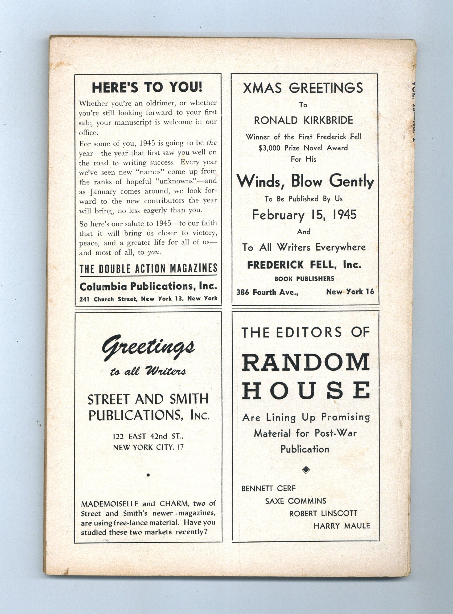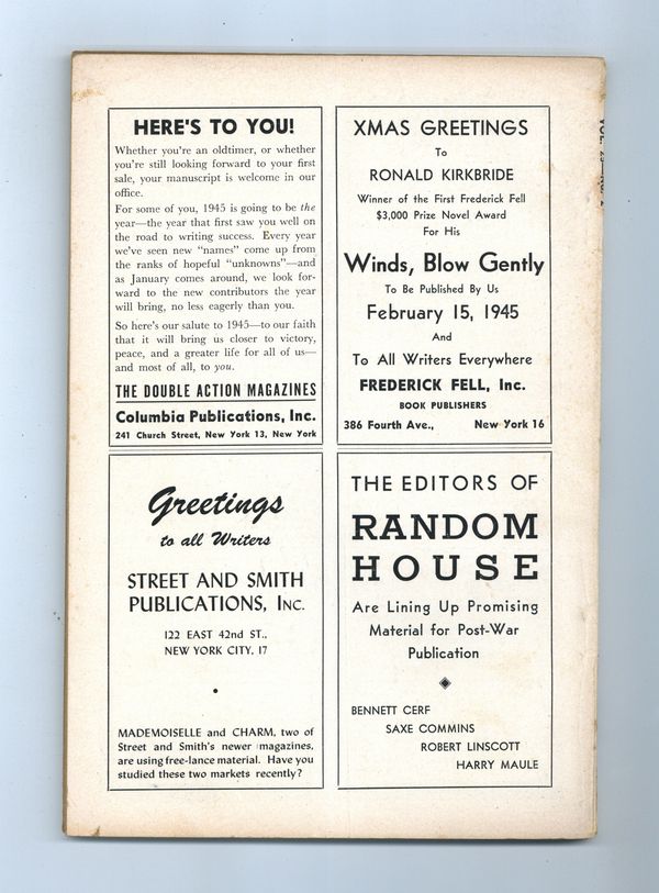 Published Jan 1945 by F+W Publications.$2.65- Front cover detached 5%. Back cover detached 5%. Coupon/Piece missing, story not affected.