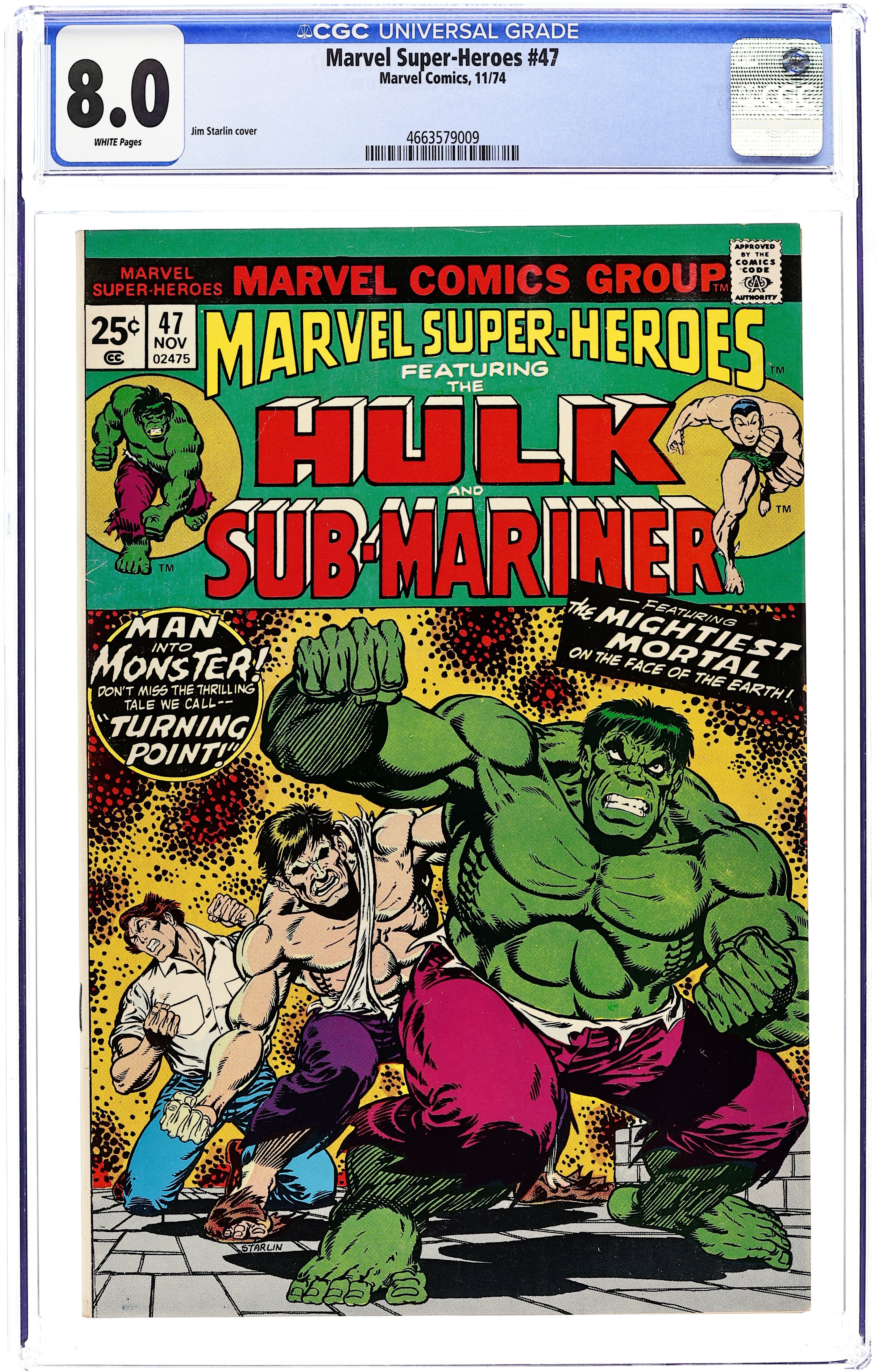 Cover art by Jim Starlin. Turning Point, script by Stan Lee, pencils by Marie Severin, inks by Frank Giacoia; Betty bemoans her loss of Bruce; Bruce, in disguise, bemoans his circumstances, then transforms into Hulk who flees his hotel room in typical Hulk fashion--through the wall; Outside, Hulk sees a 'flying saucer' and leaps to bring it down so the aliens can take him far from Earth; reprinted from Tales to Astonish #92. It Walks Like A Man, script by Stan Lee, art by Dan Adkins; Returning to Atlantis, Namor and Dorma observe a submarine dump a barrel of radioactive waste; The man-shaped 'It' rises from spilled waste and destroys a Navy offshore platform; reprinted from Tales to Astonish #92. 36 pgs. $0.25. Cover price $0.25.