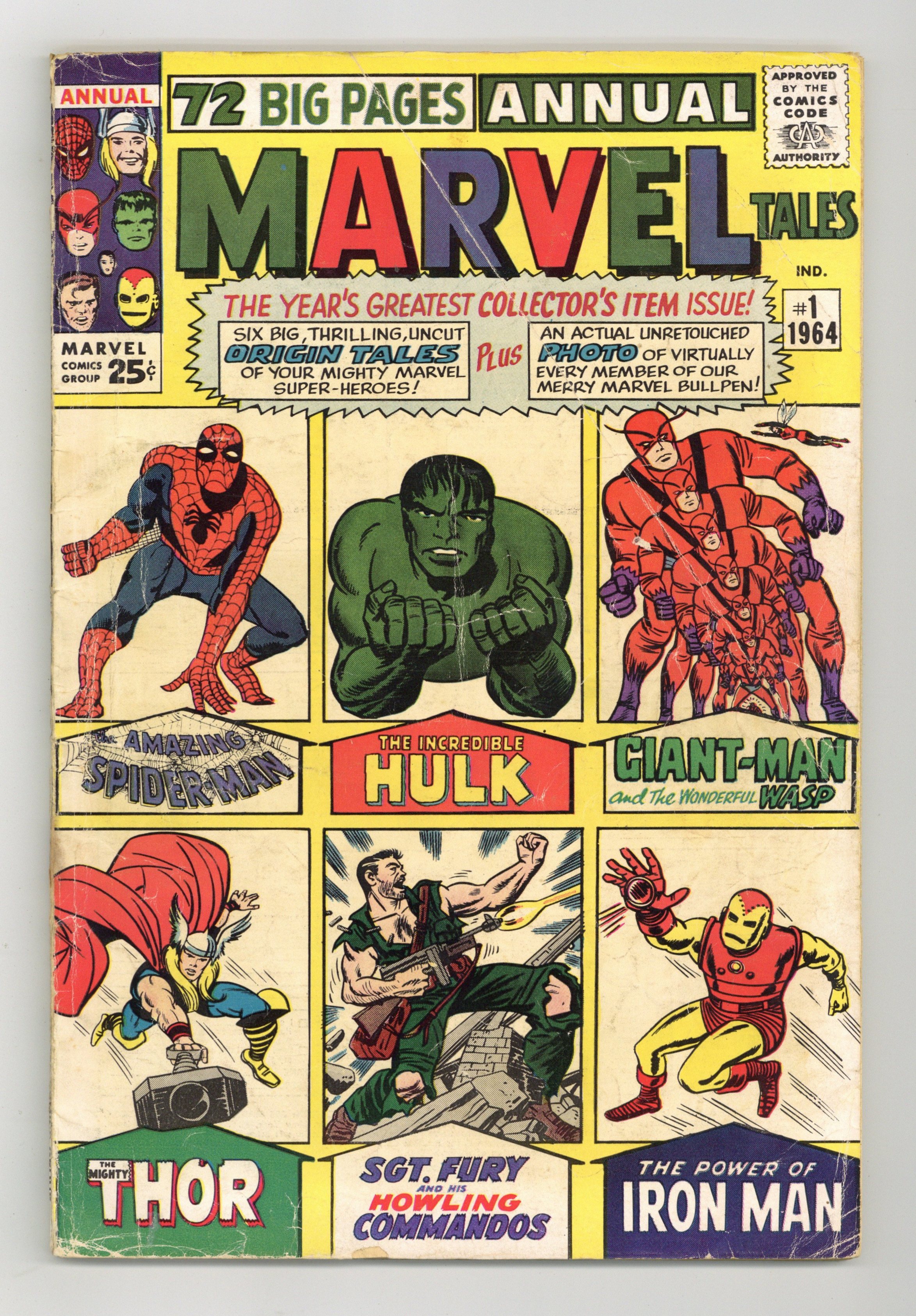 Reprints: Amazing Fantasy 15 (1st Spider-Man) by Steve Ditko; Hulk 1 by Jack Kirby, Tales to Astonish 35 (Ant-Man); Tales to Astonish 49 (Giant Man), Tales of Suspense 39 & 48 (1st Iron Man), Journey into Mystery 83 (1st Thor) by Kirby, and Sgt. Fury 1 by Kirby. Kirby photo. Cover price $0.25.