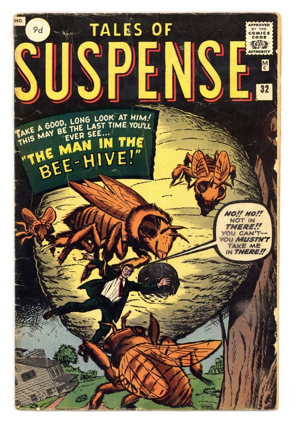 UK edition. Identical to US edition, but has 9d cover price. Cover pencils by Jack Kirby, inks by Dick Ayers. "The Man in the Beehive!", pencils by Jack Kirby, inks by Dick Ayers; An eccentric beekeeper reveals to a thief that he is a mutant with special powers; He shrinks the thief and frightens him with the attacks of the bees that are now larger than he is, but leaves him wondering if any of it was real. "Lady Luck" text story. "Sazzik the Sorcerer," pencils by Jack Kirby, inks by Dick Ayers; A TV producer of violent sensationalist drama finds a book on a sorcerer that he thinks will bring in a big profit televised; He makes the mistake of reading the printed avocation spell out loud and the spirit of the long dead mage appears and casts him into limbo. "The One Who Isn't Human," art by Don Heck; A scientist's robot goes bad, and it is so advanced that it cannot be distinguished from a human by any instruments; Only the reaction of a dog tells the police which of several suspects is the robot. "The Thing in the Sky!", script by Stan Lee, art by Steve Ditko; The communists build a super computer space-based weapons platform and issue it commands to strike targets from where it sits in orbit. 36 pgs., full color