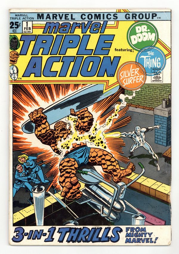 Cover pencils by John Buscema, inks by Frank Giacoia. "When Strikes the Silver Surfer," script by Stan Lee, pencils by Jack Kirby, inks by Joe Sinnott; Filled with jealousy, Ben attacks the Silver Surfer; "Enter Dr. Doom," script by Stan Lee, pencils by Jack Kirby, inks by Joe Sinnott; While Sandman attempts to free the Wizard, Dr. Doom steals the Surfer's Power Cosmic; Originally presented in Fantastic Four (1961 1st Series) #55. 68 pgs., full color. $0.25. Cover price $0.25.