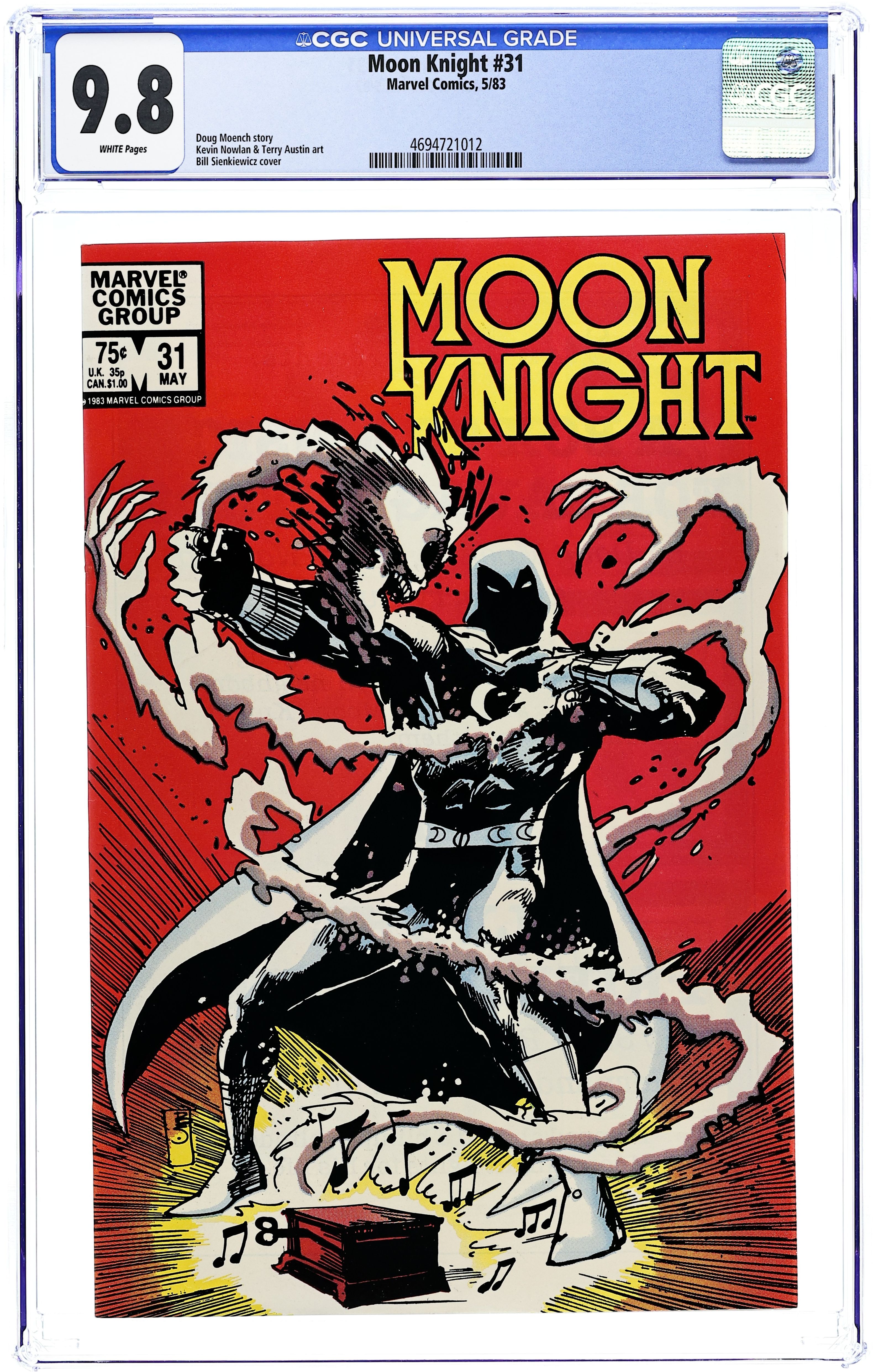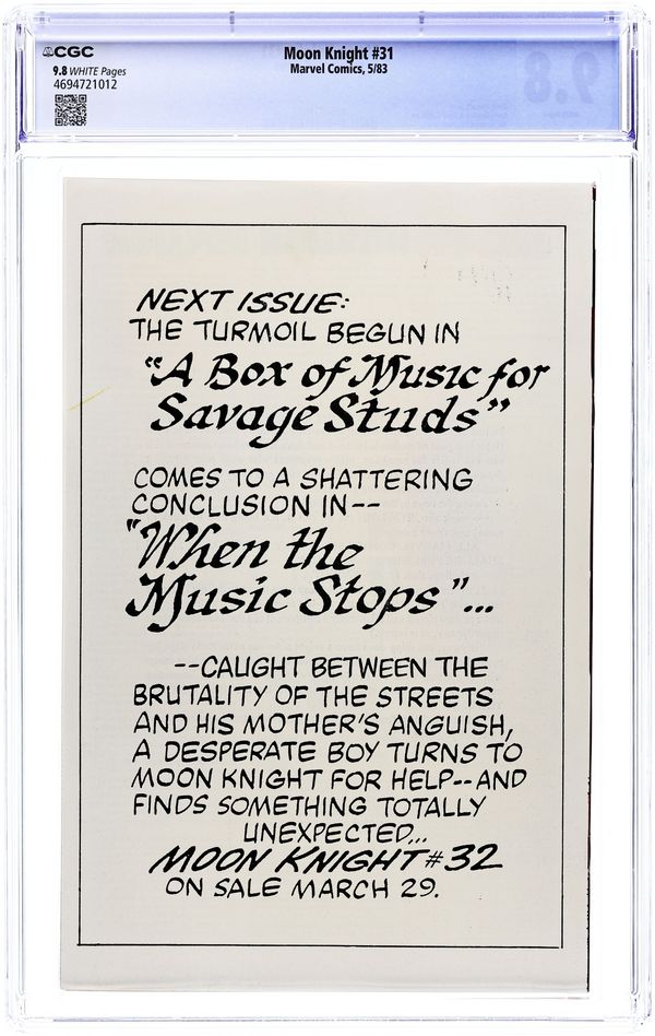 "A Box of Music for Savage Studs!" Written by Doug Moench. Art by Kevin Nowlan and Terry Austin. Cover by Bill Sienkiewicz. Merchants war with a youth gang for control of a Brooklyn meighborhood - and only Moon Knight stands between them. Includes the back-up tale "Fly the Friendly Skies!" By Steve Ringgenberg, Michael Hernandez and Kevin Dzuban. Trapped aboard a blimp, a blinded Moon Knight fights for his life! 32 pages, FC. Cover price $0.75.