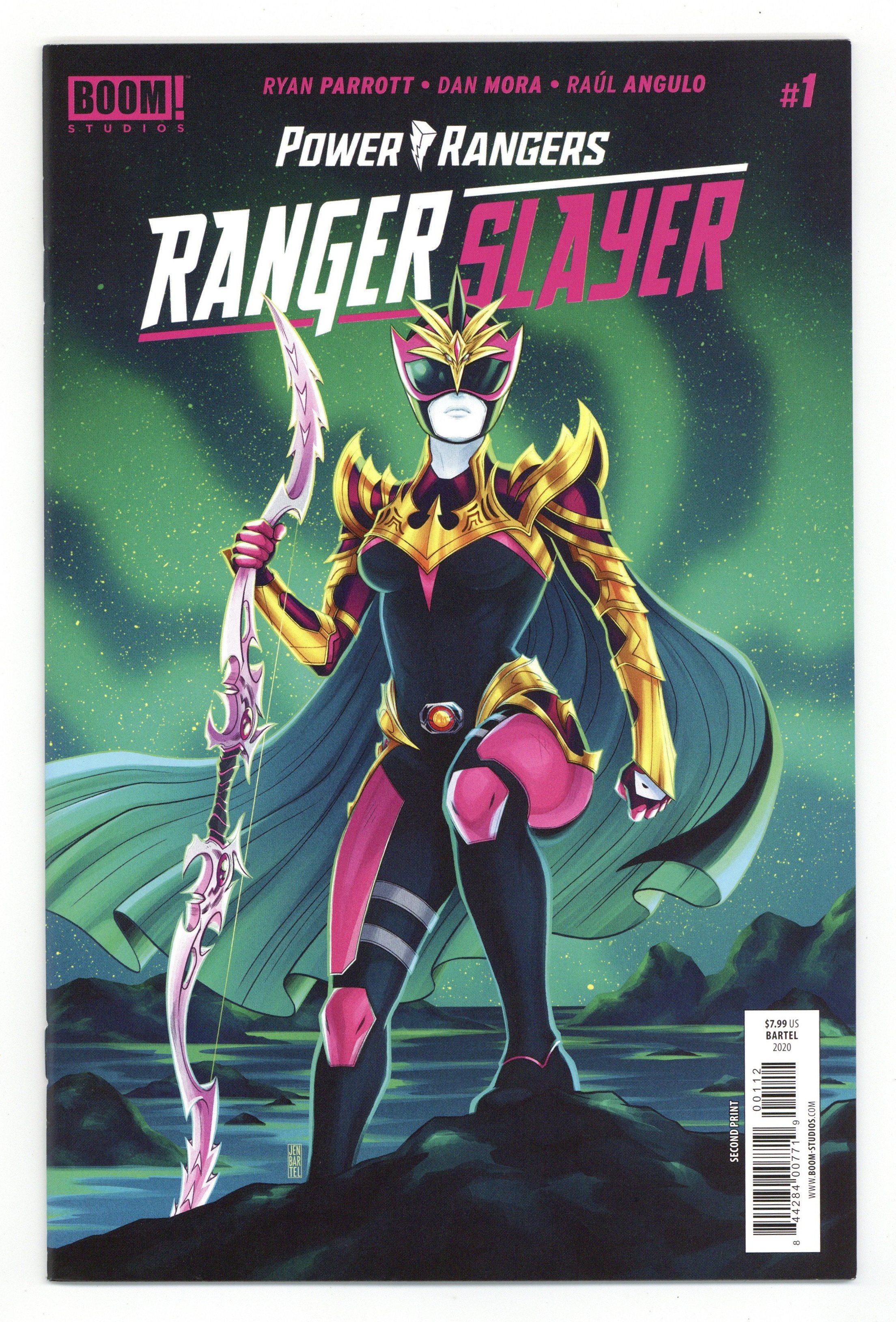 Published Jul 2020 by Boom Studios.$6.602nd Printing. Written by Ryan Parrott. Art by Dan Mora. Cover by Jen Bartel. The Ranger Slayer - a.k.a. Kimberly Hart, the Pink Mighty Morphin Power Ranger from the alternate universe once ruled by Lord Dakkon - returns home and nothing is like she expected. In a world that only knows her as a villain, can Kimberly show her universe that she's become a hero... and is that even the right thing to do? Confronted by a terrifying new version of Rita Repulsa and her home in chaos, Kimberly will make a stunning choice that no Power Rangers fan can miss. * This issue is also a perfect jumping on point for new readers - and sets the stage for the next Power Rangers epic! 40 pages, full color. Cover price $7.99.