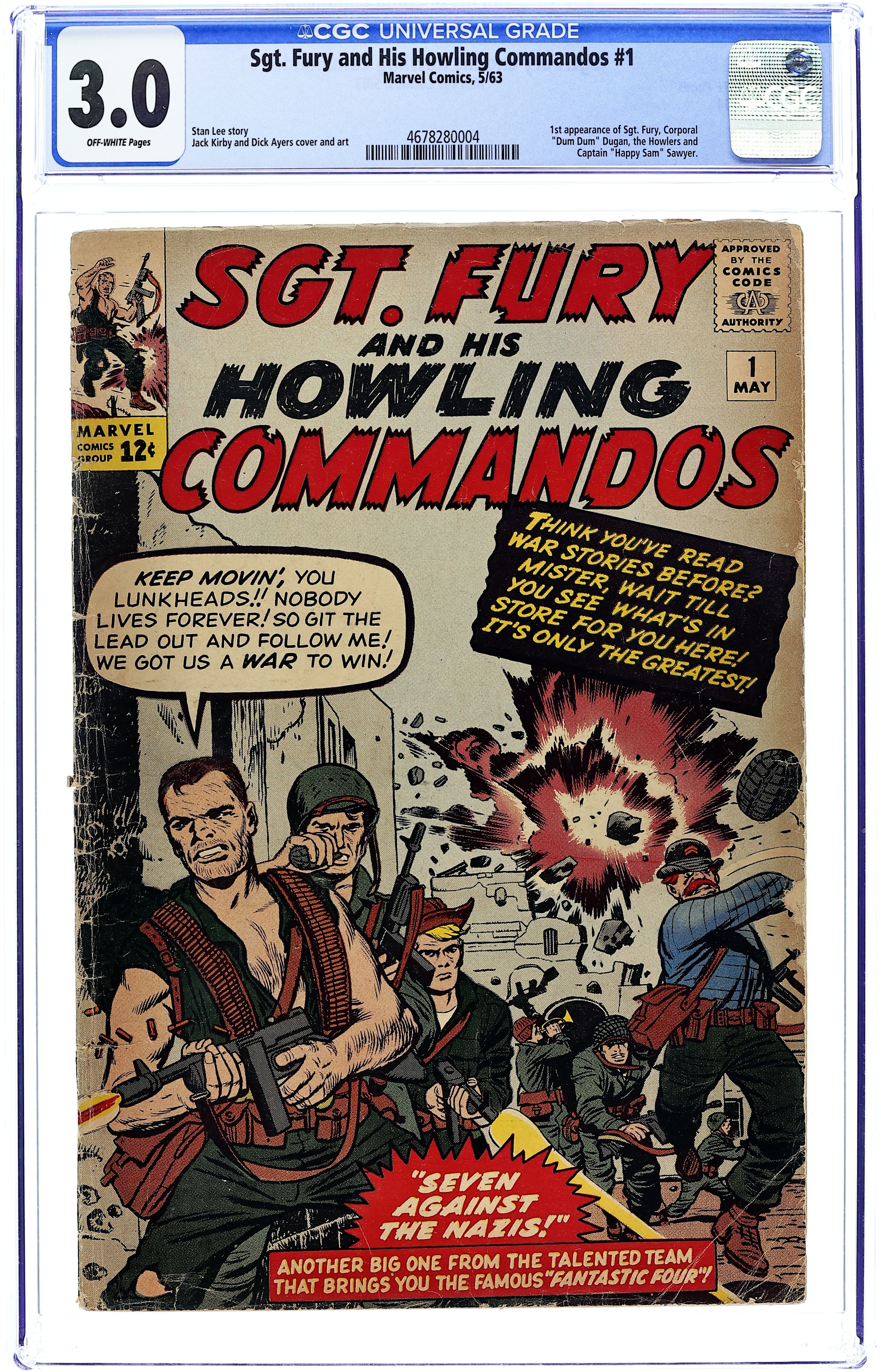 First appearance of Sgt. Fury and his Howling Commandoes. Cover pencils by Jack Kirby, inks by Dick Ayers. Sgt. Fury and His Howling Commandos, script by Stan Lee, pencils by Jack Kirby, inks by Dick Ayers; The Commandos are ordered to rescue the Underground leader, captured by the nazis, before he reveals the date of D-Day. 36 pgs. $0.12. Cover price $0.12.