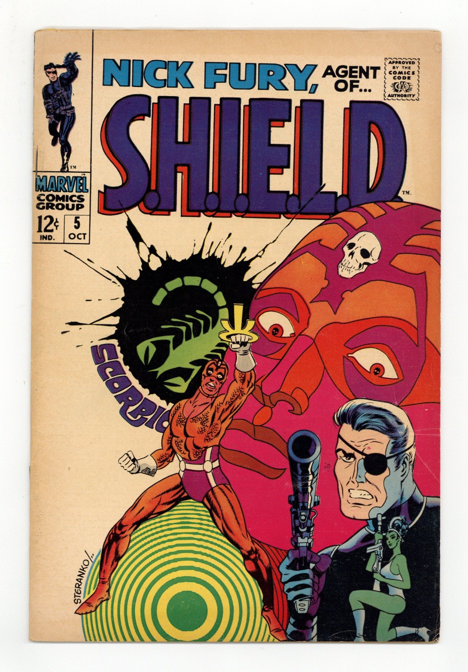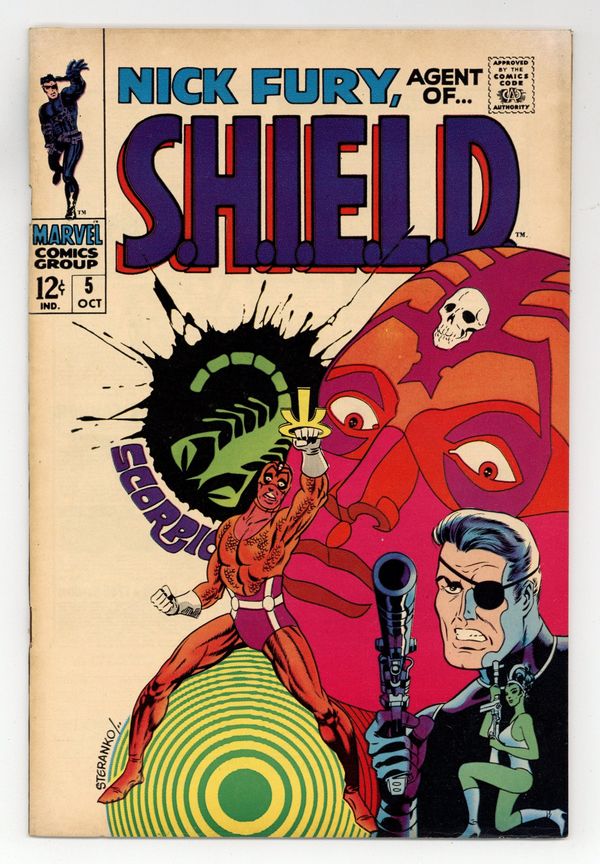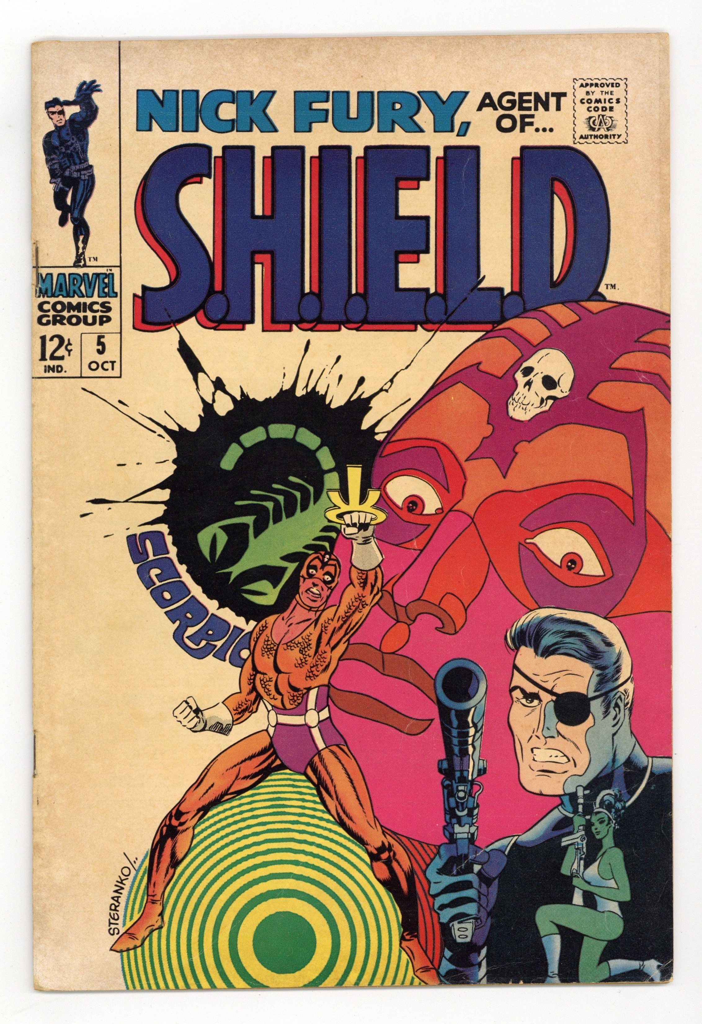 Cover by Jim Steranko. "What Ever Happened To Scorpio?", script by Jim Steranko, pencils by Jim Steranko, inks by John Tartaglione; Val reads Nick's horoscope in the morning paper, which says "Someone in your past will return today"; Nick pays a visit on Pickman, who's helping him locate someone, and he doesn't want SHIELD involved; The ESP Division picks up "possible danger", sending Nick to a seemingly-deserted warehouse - and straight into a trap set by Scorpio!; Nick's Farrari is destroyed, and Nick is captured; While unconscious, Scorpio creates a face-mask to allow him to impersonate Nick, then goes in disguise to view the test of the latest model of LMD; But as it begins, no one else realizes the robot has been replaced with Nick, drugged so he can't speak!; Miraculously, Fury manages to dodge one death trap after another, then faces his would-be killer; Val, trying to save Nick's life, shoots at the "LMD" - but hits Pickman instead, who found his way in via a secret passage. Letters to the editor from comics writer Don McGregor and fanzine publisher Ronn Foss. 36 pgs., full color. $0.12. Cover price $0.12.