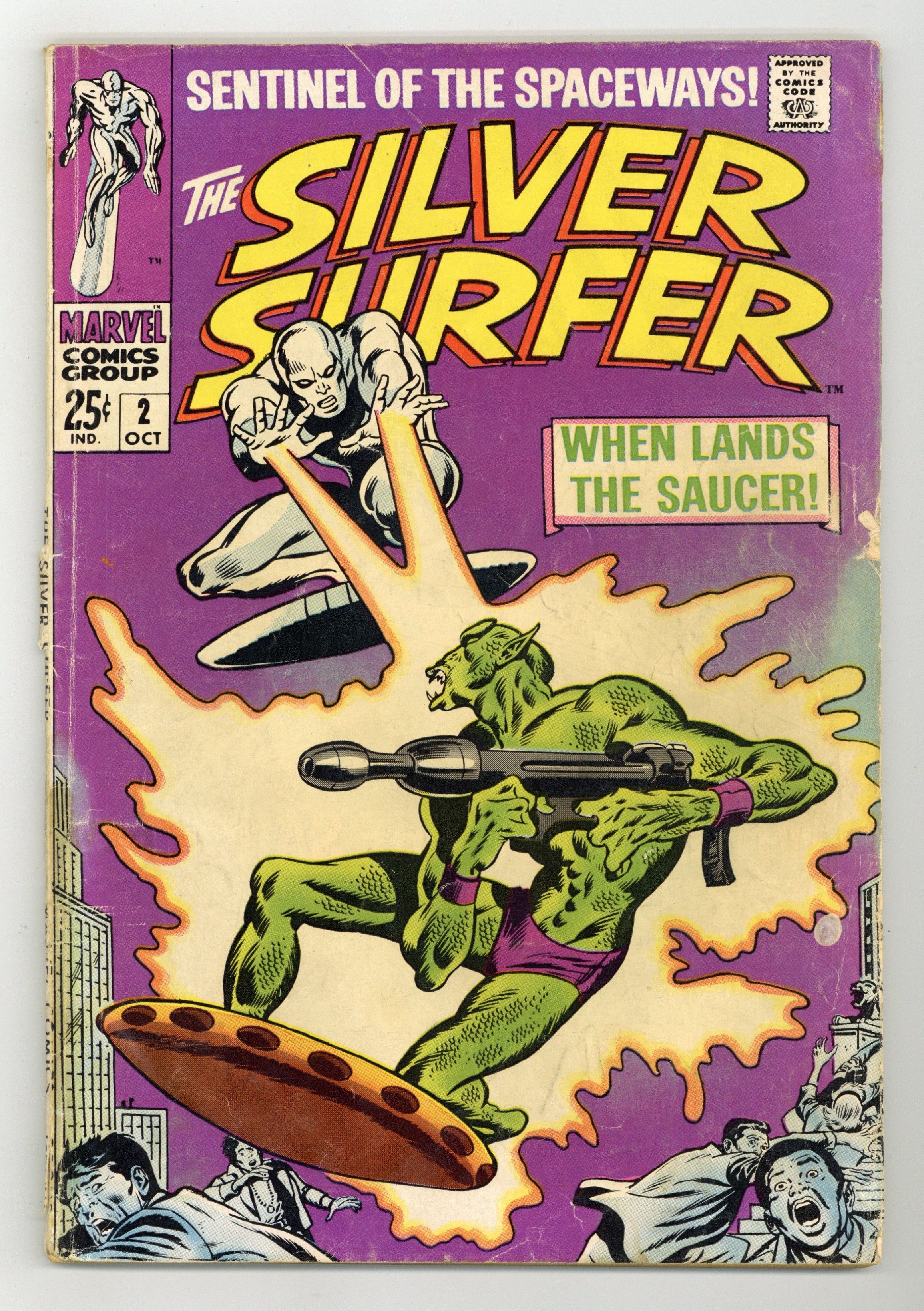 "When Lands the Saucer!" Written by Stan Lee. Art and cover by John Buscema and Joe Sinnott. Exiled to planet Earth by his former master, Galactus, the Silver Surfer, a being empowered with the Power Cosmic itself, finds he cannot penetrate the invisible barrier which the Devourer of Worlds has encompassed the planet with. However, this barrier does not prevent others from beyond the stars from coming to Earth and wrecking havoc. Thus, when a malevolent race of aliens descend upon the unsuspecting citizens of Earth, only the Silver Surfer possesses the power to stop them. Includes the Watcher back-up "The Coming of the Krills!" Story by Stan Lee. Art by Gene Colan and Paul Reinman. 68 pages Cover price $0.25.
