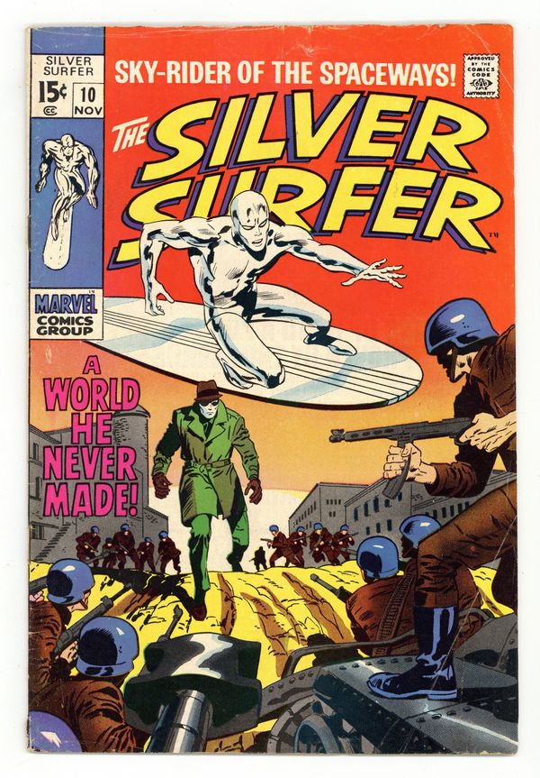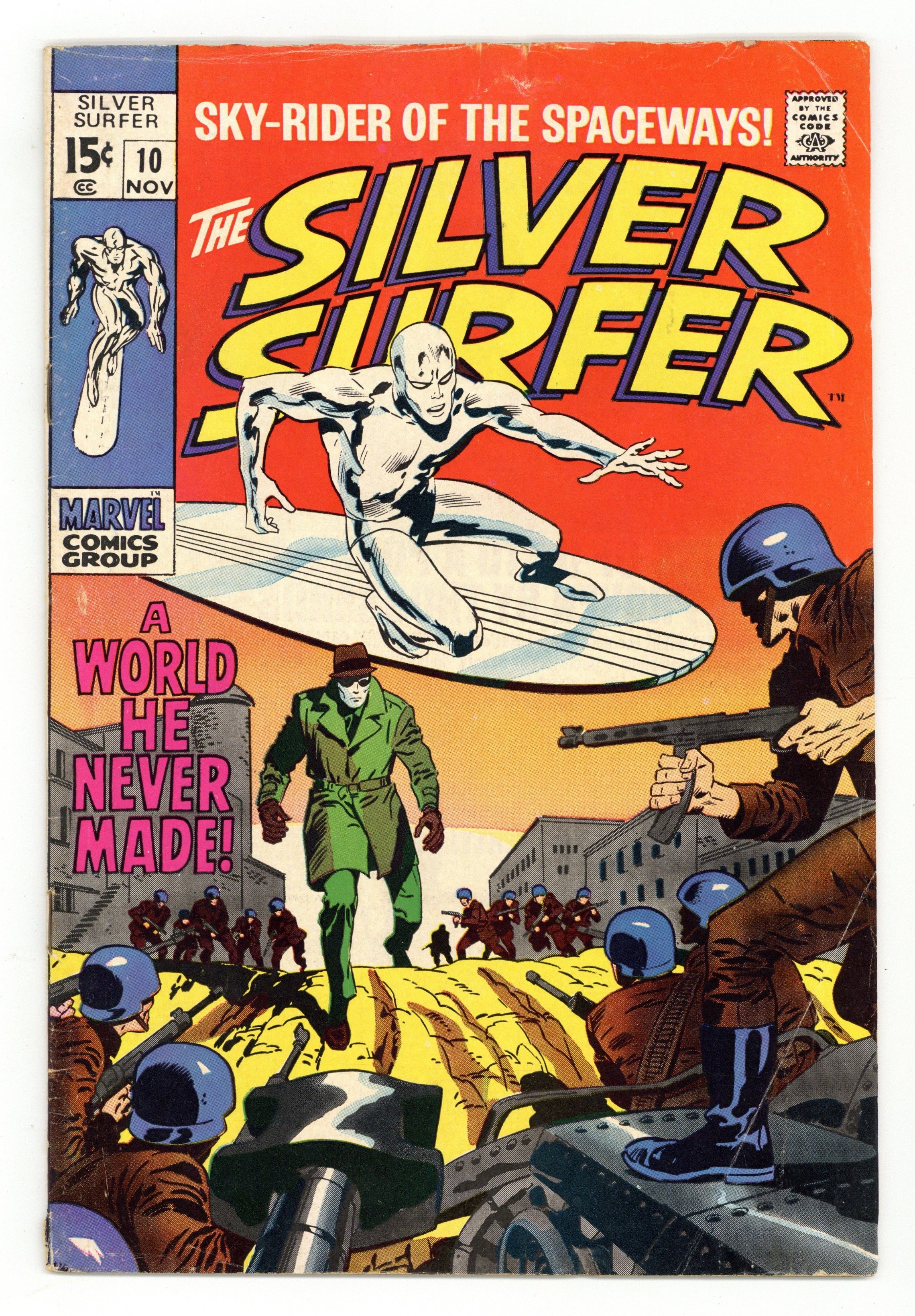 "A World he Never Made!" Part 1 of 2. Written by Stan Lee. Art by John Buscema and Dan Adkins. In an effort to better understand mankind, the Silver Surfer ventures among them, incognito. Cover price $0.15.