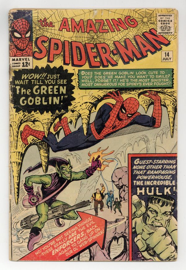 Cover art by Steve Ditko. First appearance of the Green Goblin (Norman Osborn) in The Grotesque Adventure of the Green Goblin!, script by Stan Lee, art by Steve Ditko; The Green Goblin hires the Enforcers to help him defeat Spider-Man; To further his plan he convinces B.J. Cosmos to film a movie of Spider-Man fighting Goblin and the Enforcers in the desert; While filming, Goblin and the Enforcers attack Spider-Man and accidentally awaken the Hulk. Reprinted in Marvel Tales # 9 and 152. 36 pgs. $0.12. Cover price $0.12.