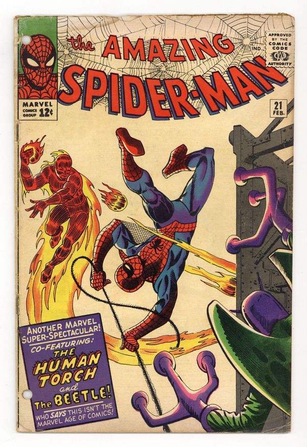 Starts Jan 3 Cover art by Steve Ditko. Second appearance of the Beetle in Where Flies the Beetle...!, script by Stan Lee, art by Steve Ditko; after getting out of jail, Abner Jenkins dons his Beetle guise and prepares for revenge on the Human Torch; drama between Johnny Storm and Doris Evans and Peter Parker and Betty Brant; Human Torch teams with Spidey against Beetle. Reprinted in Marvel Tales # 16 and 159. Spider-Man pin-up by Ditko. 36 pgs. $0.12. Cover price $0.12.