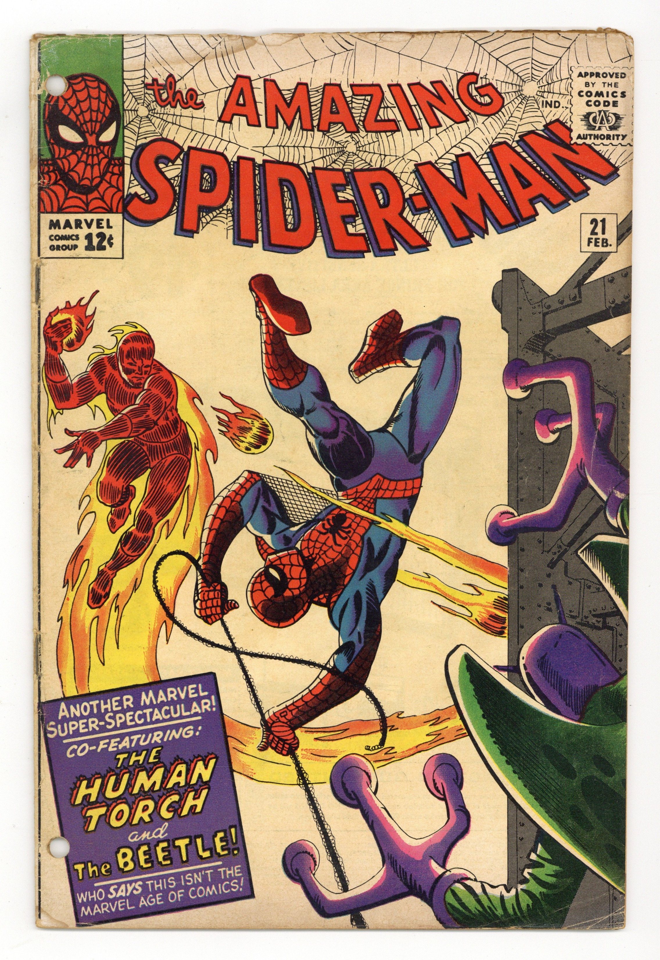 Cover art by Steve Ditko. Second appearance of the Beetle in Where Flies the Beetle...!, script by Stan Lee, art by Steve Ditko; after getting out of jail, Abner Jenkins dons his Beetle guise and prepares for revenge on the Human Torch; drama between Johnny Storm and Doris Evans and Peter Parker and Betty Brant; Human Torch teams with Spidey against Beetle. Reprinted in Marvel Tales # 16 and 159. Spider-Man pin-up by Ditko. 36 pgs. $0.12. Cover price $0.12.