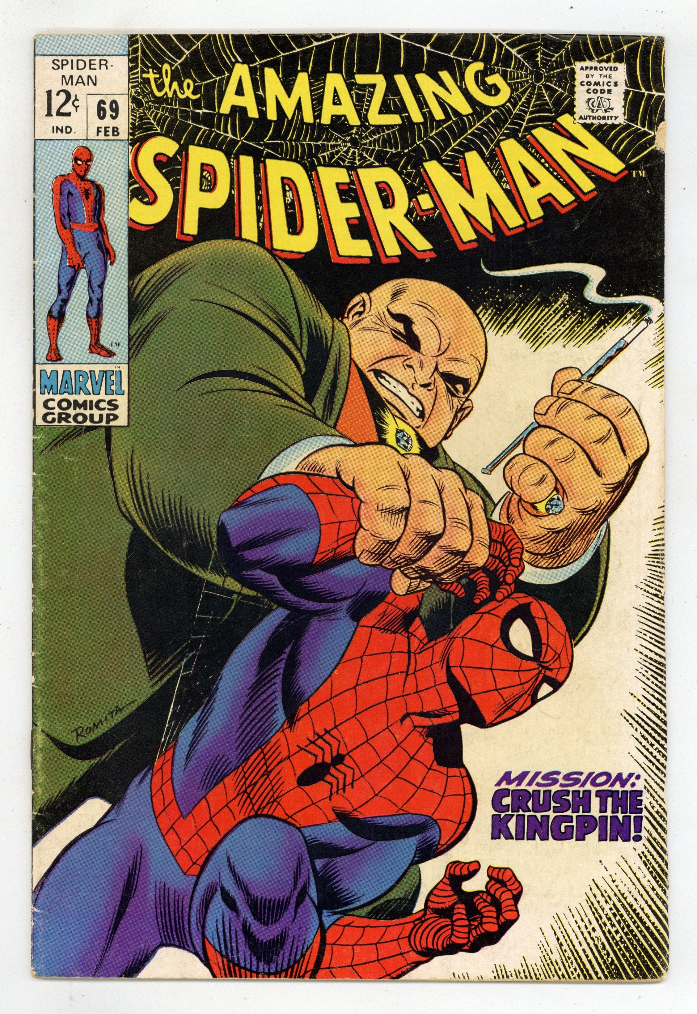 "Mission: Crush the Kingpin!" Part 2 of 3. Plot by John Romita. Script by Stan Lee. Art by John Romita (layouts) and Jim Mooney (finishes). Cover by John Romita. The Spectacular Spider-Man is on the hunt for the Kingpin-- after the crime boss stole the ancient clay tablet from the ESU exhibit hall. However the Kingpin actually wants the web-slinger to find him, so he can polish off the wall-crawler permanently! When the amazing one locates Wilson Fisk's hideaway...another great battle between Spider-Man and the Kingpin erupts! Who will win this time? And where is the clay tablet? Cameo appearances by Captain Stacy, Gwen Stacy, J. Jonah Jameson, Joe Robertson, and Randy Robertson. (Notes: The first mention of the Kingpin's wife occurs in this issue. The letters page includes a letter from comics artist Kerry Gammill. This story was reprinted in Marvel Tales #52.) 36 pages. Cover price $0.12.