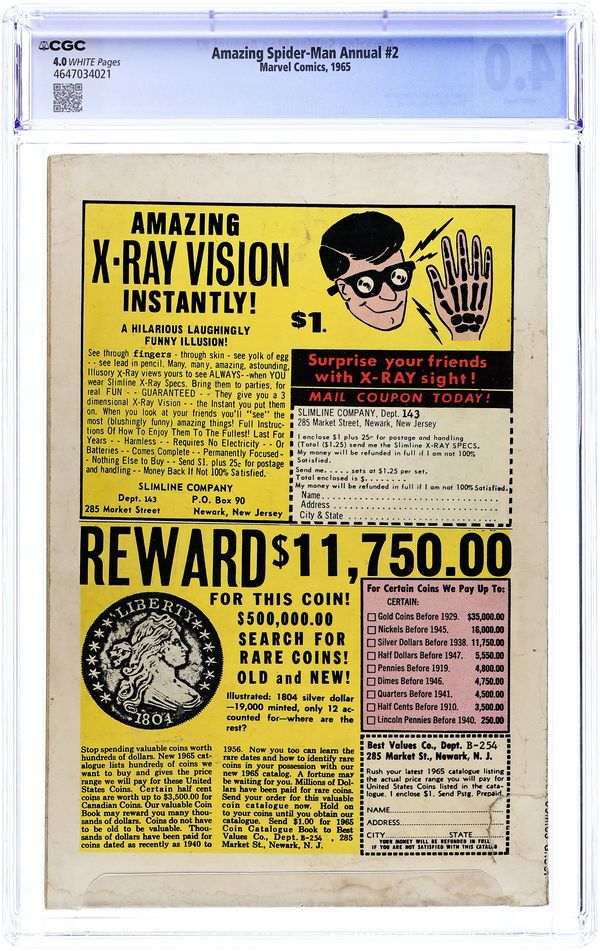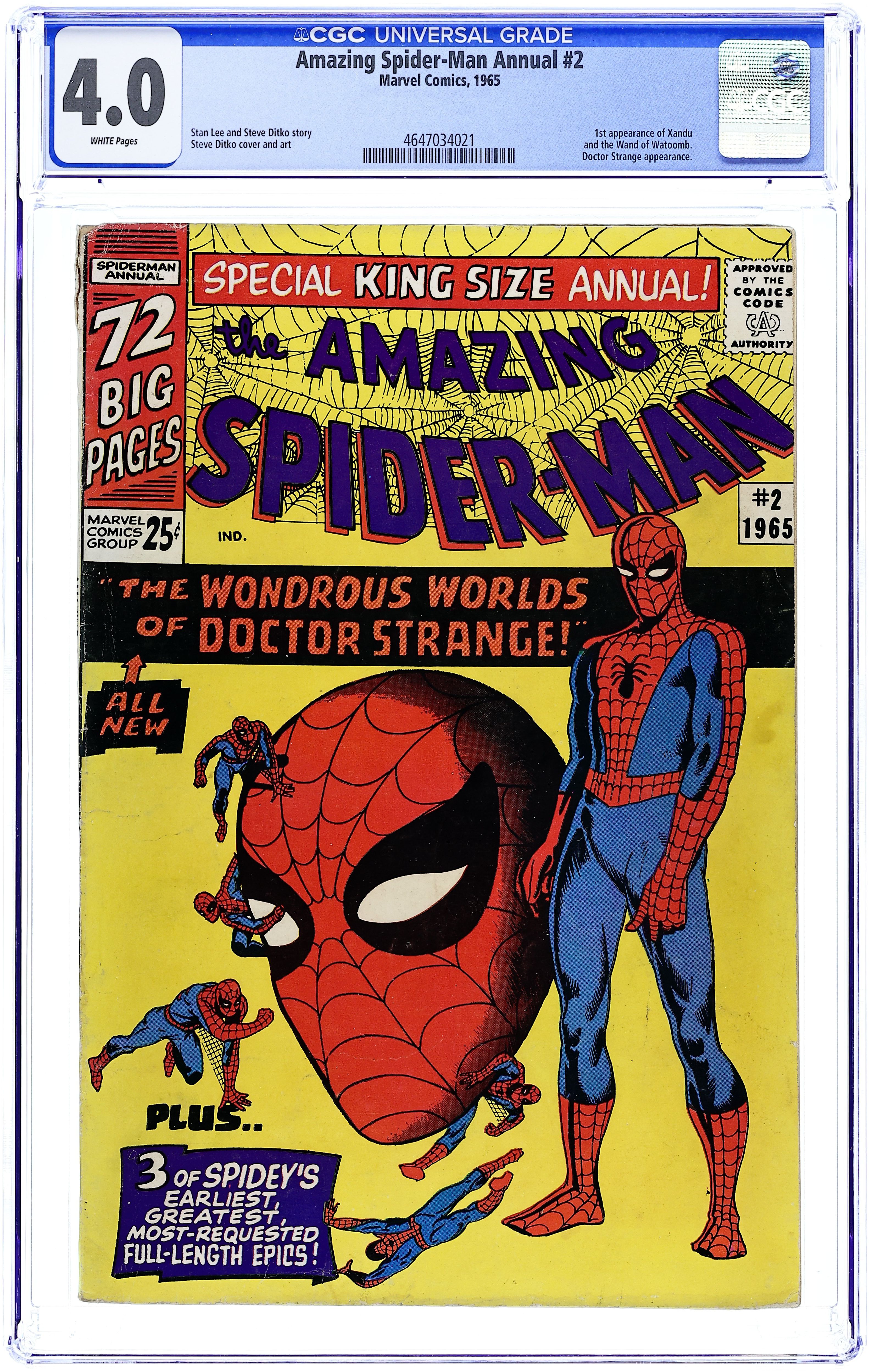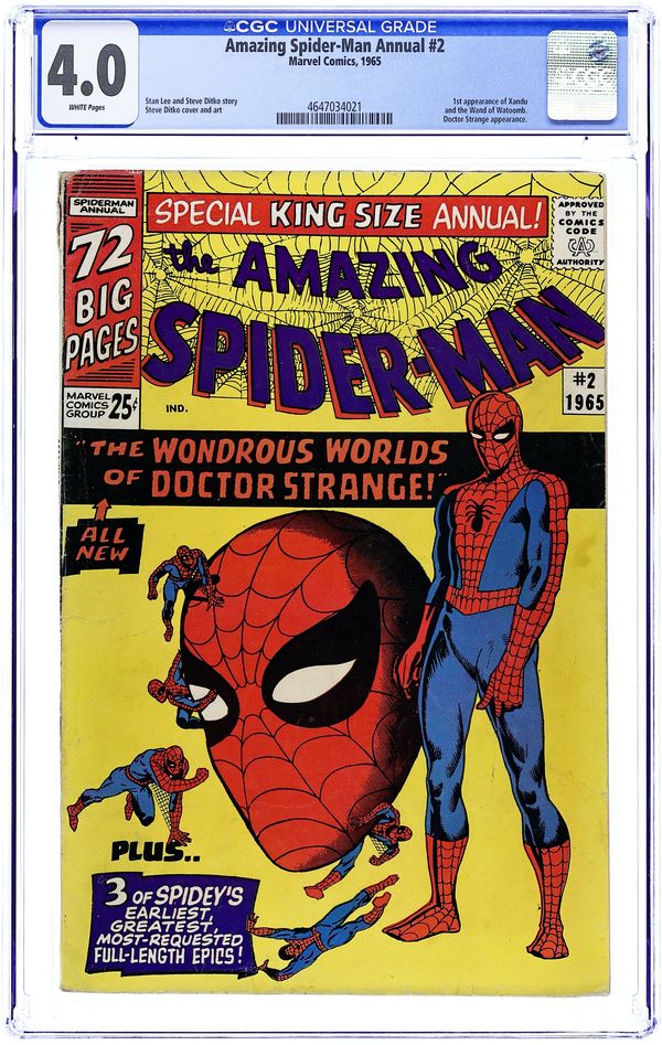 Ends Feb 23 7:18 PM CST Bid History 4 bids Current Bid $17 Your Secret Max Bid If you'd like to bid, please log in or register. Cover art by Steve Ditko. Doctor Strange guest stars in an all-new 20-page story, "The Wondrous World of Doctor Strange!", script by Stan Lee, art by Steve Ditko; Xandu sends his two henchmen to retrieve half of the Wand of Watoomb from Dr. Strange; Spider-Man mistakes the henchmen for burglars and tries to stop them, leading to a team up between Spider-Man and Dr. Strange to stop Xandu's plan. Spider-Man, script by Stan Lee, art by Steve Ditko; Spider-Man rescues John Jameson, J. Jonah Jameson's son, from his malfunctioning space capsule; reprinted from Amazing Spider-Man 1. The Uncanny Threat of the Terrible Tinkerer!, script by Stan Lee, art by Steve Ditko; When Peter Parker discovers some alien modifications to a professor's radio he tracks down a group of aliens with plans to take over the Earth; reprinted from Amazing Spider-Man 2. Marked for Destruction by Dr. Doom!, script by Stan Lee, art by Steve Ditko; Dr. Doom tries to trick Spider-Man into helping him defeat the Fantastic Four. Ditko also provides 5 pages of new pin-ups (Spider-Man's famous foes). Finally, there are three reprints from Amazing Spider-Man 1 ("Spider-Man"), 2 ("The Uncanny Threat of the Terrible Tinkerer!"), and 5 ("Marked for Destruction by Dr. Doom!"). Giant 76-page special! Reprinted in Marvel Tales # 167. 76 pgs., full color. Cover price $0.25.