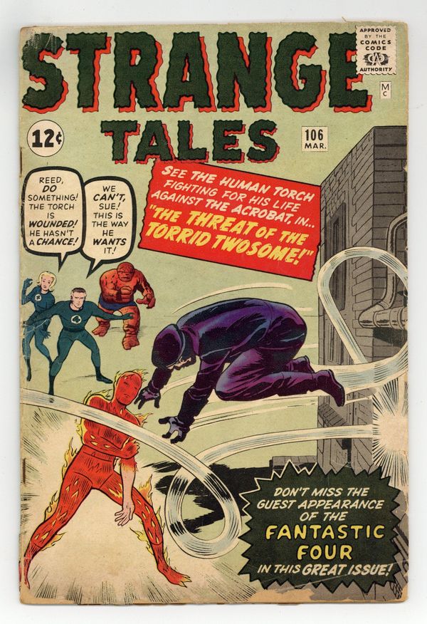 Cover pencils by Jack Kirby, inks by Dick Ayers. The Human Torch stars in "The Threat of the Torrid Twosome," script by Stan Lee (plot) and Larry Lieber (script), art by Dick Ayers; The Acrobat tricks the Human Torch into helping him rob a bank before double crossing him; The Torch chases and captures the thief with the help of the Fantastic Four. "The Recipe" text story. "Man on the Scaffold!", script by Stan Lee, art by Steve Ditko; A teller of tall tales becomes the butt of some ribbing when he tries to tell his fellow painters that he has acquired some magic paints. "The Mystery of the Purple Planet!", script by Stan Lee (plot) and Larry Lieber (script), art by Paul Reinman; A space expedition is sent to a distant planet when it is suddenly covered with an artificial mist; The team finds gold and takes it, but are transformed into aliens like the inhabitants. 36 pgs., full color. Cover price $0.12.