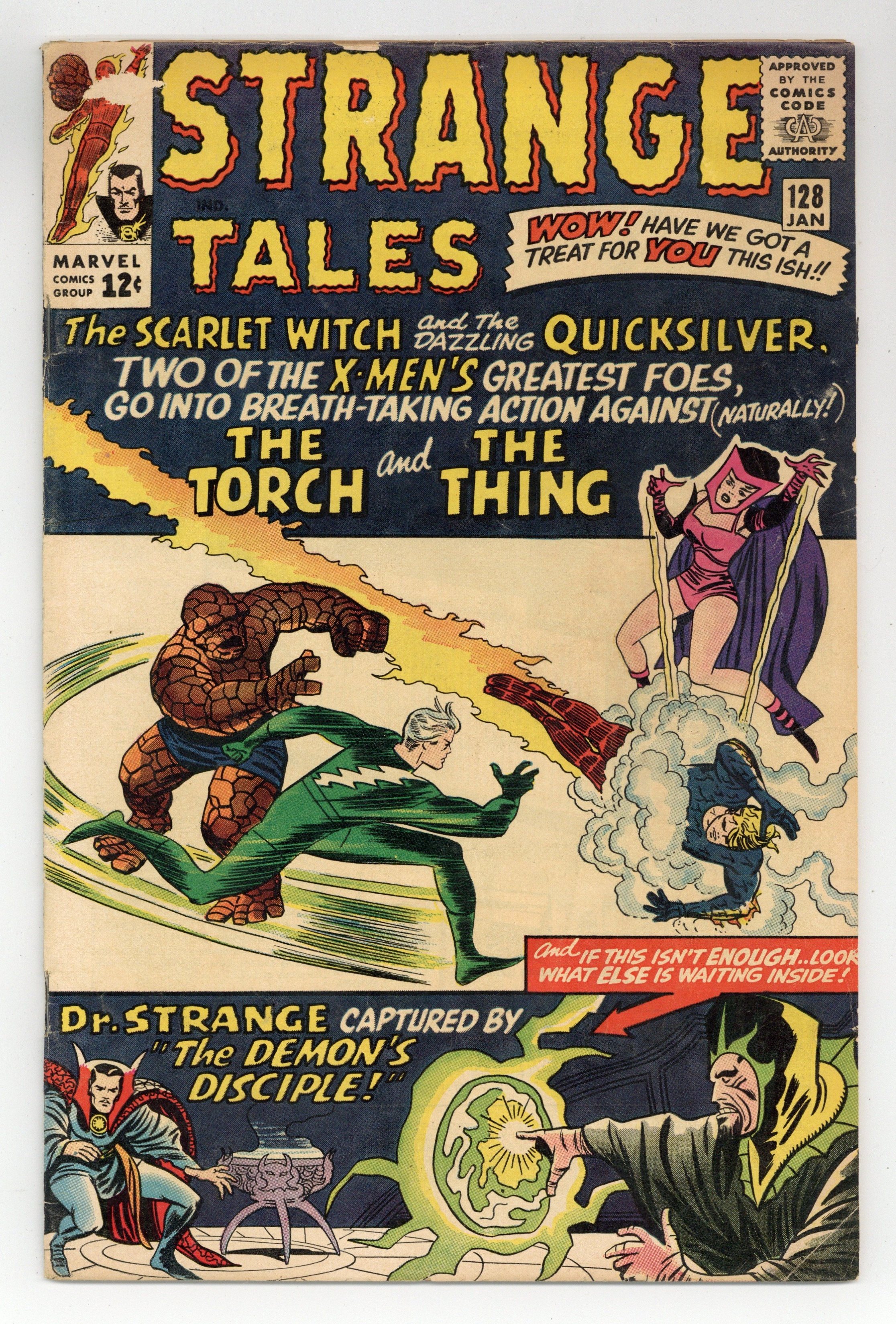 Starts Feb 9 Cover pencils by Jack Kirby, inks by Sol Brodsky. The Human Torch and the Thing guest star in "Quicksilver and the Scarlet Witch," script by Stan Lee and Dick Ayers (co-plot), pencils by Dick Ayers, inks by Frank Giacoia (as Frank Ray); Quicksilver wants to leave Magneto's group but his sister Wanda reminds him that she is in his debt; The Scarlet Witch takes her brother's lead and they seek out the Fantastic Four for advice; They encounter Ben and Johnny at FF headquarters where a misunderstanding turns into a brawl; Cameos by the X-Men (Angel, Cyclops, Marvel Girl, and Iceman), Magneto, the Mastermind, the Blob, and the Yancy Street Gang. Dr. Strange Master of the Mystic Arts illustration by Steve Ditko. "The Demon's Disciple!", script by Steve Ditko (plot, uncredited) and Stan Lee (dialogue), art by Steve Ditko; Dr. Strange receives a desperate plea for help from a man who became a disciple of someone called The Demon, not realizing the seriousness of the situation; The Demon transports the man back to his lair and consigns him to a pit beneath the floor; Strange tracks the man's location and confronts the evil mystic in an epic battle. 36 pgs., full color. Cover price $0.12.