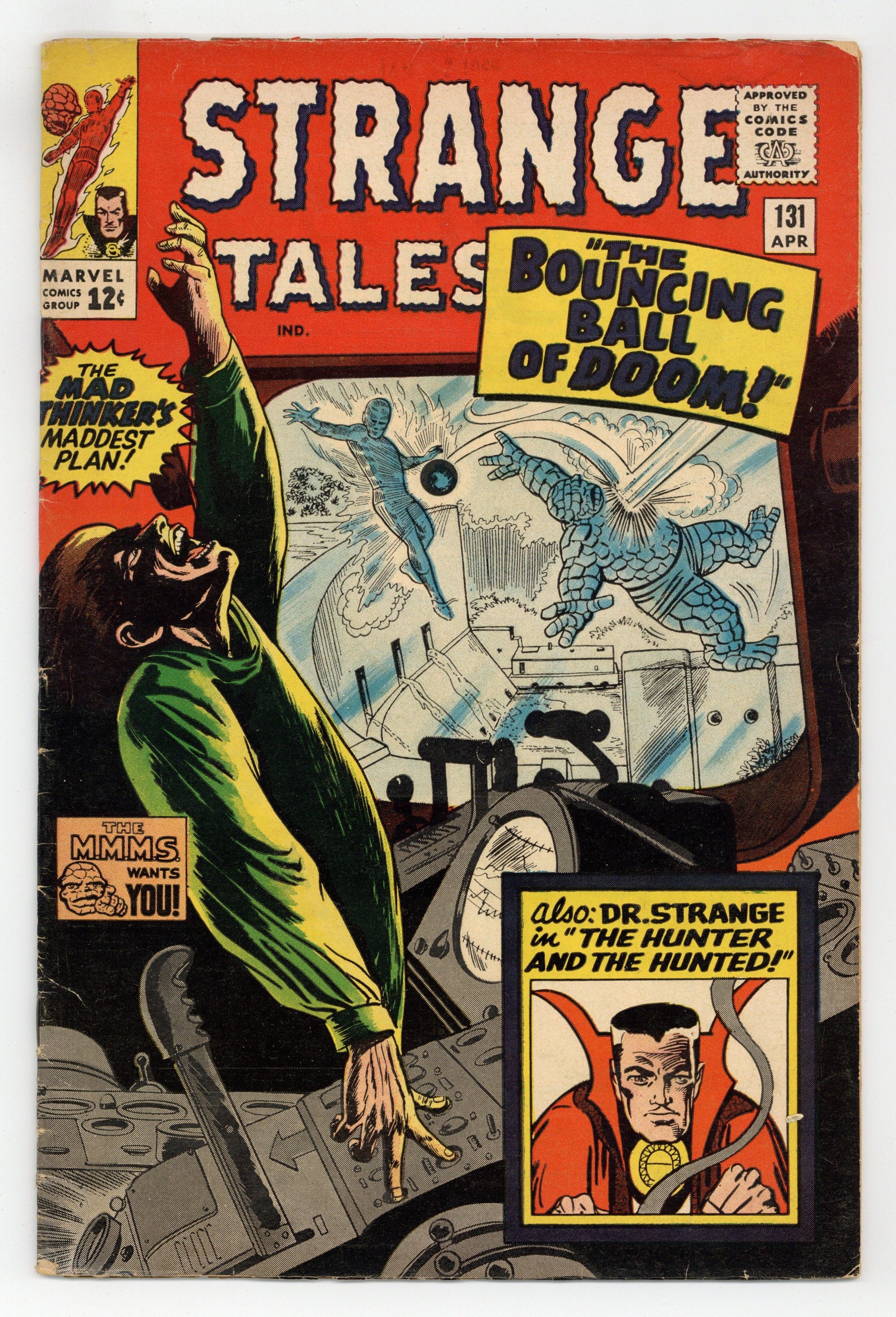 Starts Feb 2 Cover pencils by Bob Powell, Steve Ditko (Dr. Strange figure), inks by Mike Esposito and Steve Ditko (Dr. Strange figure). The Human Torch and the Thing star in "The Bouncing Ball of Doom!", script by Stan Lee and Bob Powell (co-plot), pencils by Bob Powell, inks by Dick Ayers; The Mad Thinker's latest plot involves a flying, electronics-laden metal ball, which nearly manages to destroy a dam; Cameos by Reed Richards and Sue Storm. "The Hunter and the Hunted!", script by Steve Ditko (plot) and Stan Lee (dialogue), art by Steve Ditko; In the far East, Strange is on the run from Mordo and his minions, unaware that Mordo's increased power comes from Dormammu; As Mordo forcibly recruits more followers to search for Strange the mage makes plans to hop a plane to New York City. Statement of ownership--average print run 315,500; average paid circulation 214,800. 36 pgs., full color. Cover price $0.12.