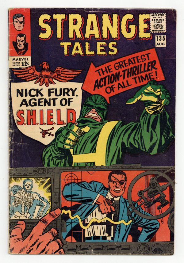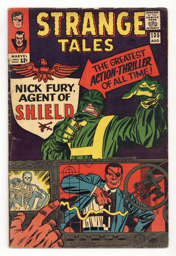 Cover pencils by Jack Kirby, inks by Frank Giacoia. "The Man for the Job!", script by Stan Lee and Jack Kirby (co-plot), pencils by Jack Kirby, inks by Dick Ayers; Nick Fury reports to the Pentagon, encountering Life Model Decoys: replicas of himself; He is driven in a gadget-filled car that converts to flying mode; Fury learns about SHIELD, an international organization whose job is to stop HYDRA, fanatics bent on world domination; Fury meets Tony Stark, in charge of SHIELD's weaponry, who tells Fury he was chosen to lead SHIELD. "Eternity Beckons!", script by Steve Ditko (plot) and Stan Lee (dialogue), art by Steve Ditko; In London, seeking info on "Eternity," Dr. Strange goes to the secluded home of Sir Baskerville, a former disciple of Mordo's, who greets him as an old friend; Meanwhile, Dormammu discovers that Clea set the Mindless Ones free and swears she will pay for her betrayal; Baskerville contacts Mordo, who sends an emissary to trap Strange but it backfires, allowing Strange to discover that Dormammu is the one behind Mordo's attacks and increased power. Notes: 1st S.H.I.E.L.D., 1st Hydra, 1st Nick Fury as agent of shield, 1st appearance of LMD (Life Model Decoy). 36 pgs., full color. Cover price $0.12.