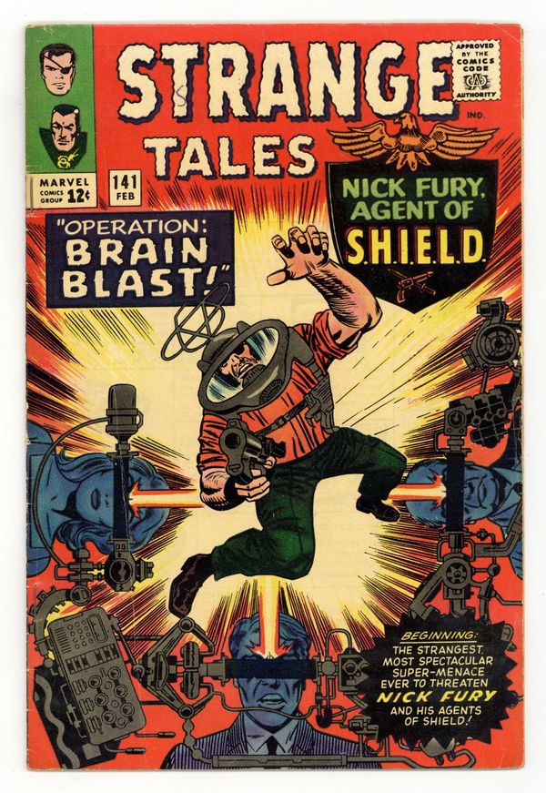 Cover pencils by Jack Kirby, inks by Frank Giacoia. Nick Fury stars in "Operation: Brain Blast!", script by Stan Lee and Jack Kirby (co-plot), pencils by Jack Kirby, inks by Frank Giacoia (as Frank Ray); Supreme Hydra Arnold Brown cannot press the destruct button knowing his daughter would also perish; Unconvinced he is Supreme Hydra his guards execute him; Fury lets Agent G escape when she demonstrate Hydra's Vacuum-sole shoes; SHIELD's E.S.P. Division uses the Brainwave Stimulator to send Fury a mental warning of a mock attack. "Let There Be Victory!", script by Steve Ditko (plot) and Stan Lee (script), art by Steve Ditko; Dormammu consigns Mordo to the Dimension of Demons; Strange declares he is able to continue the fight and manages to best him in combat!; Dormammu swears not to attack Earth; Back in The Ancient One's home, Hamir prepares a banquet for Strange & his master; Dormammu banishes Clea to a place where Strange can never find her. 36 pgs., full color. Cover price $0.12.