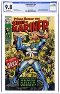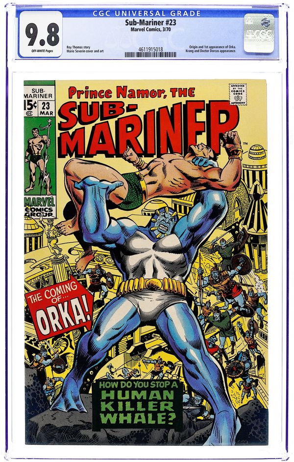 Cover pencils by Marie Severin, inks by Mike Esposito. First appearance of Orka in "The Coming of Orka," script by Roy Thomas, pencils by Marie Severin, inks by Johnny Craig; Returning to his undersea realm, Namor comes across a large herd of killer whales, led by the monstrous Orka, and takes him on; Namor is defeated by Orka, but follows him and discovers that Dr. Dorcas and Krang are actually behind Orka's powers, and are planning an attack on Atlantis; Namor gains the upper hand by threatening Krang's life which prompts Orka to turn against Dorcas; However, Namor's plan comes undone and he's taken down hard by Orka; Following Krang's orders, Orka puts a stun-collar and chains on the Sub-Mariner; Krang then announces an intention of marching into Atlantis with an enslaved Namor. 36 pgs., full color. $0.15. Cover price $0.15.