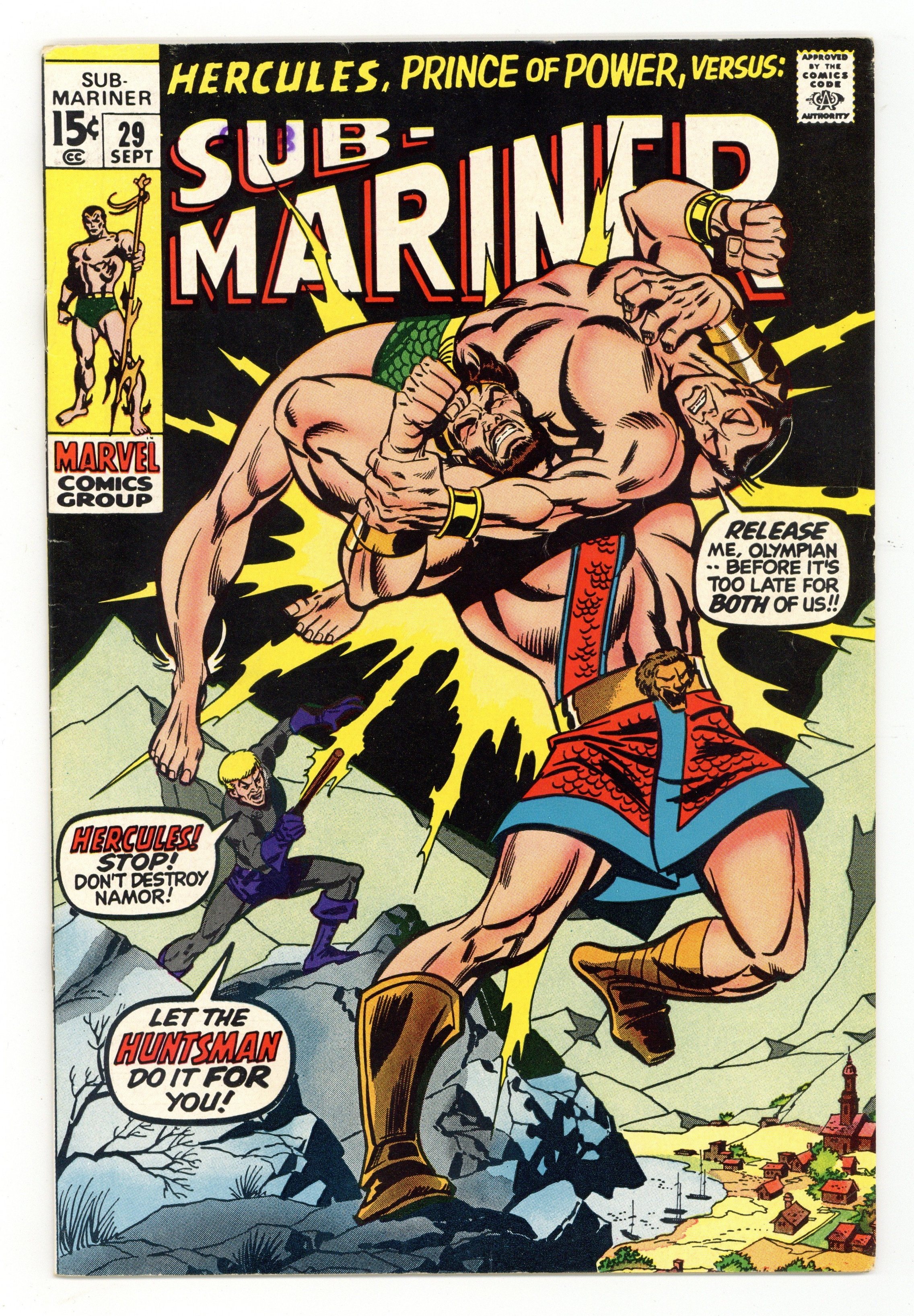 Cover pencils by Sal Buscema. "Fear Is the Hunter!", script by Roy Thomas, pencils by Sal Buscema, inks by Mike Esposito (as Joe Gaudioso); The Huntsman uses the Sirens' call to lure in Namor and sap his will; He then sets Namor after Hercules who the Huntsman has been ordered by Zeus to return to Olympus; Namor finds Hercules and attacks him; He comes to his senses when their battle threatens some villagers; The Huntsman then summons monsters from Greco-Roman mythology to defeat Hercules; Together Namor and Hercules defeat the monsters and the Huntsman; However, Zeus takes note of the battle and Namor's valor and brings his son back to Olympus to discuss Hercules' sojourn on Earth. Cont'd from Ka-Zar #1; Hercules appears next in Avengers #98. 36 pgs., full color. $0.15. Cover price $0.15.