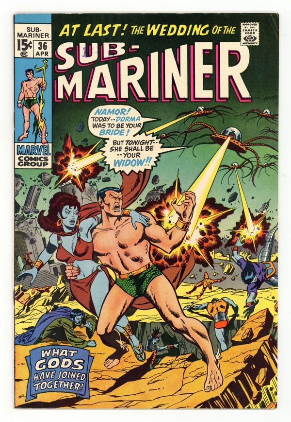 Cover by Sal Buscema. "What the Gods Have Joined Together," script by Roy Thomas, pencils by Sal Buscema, inks by Bernie Wrightson; Namor seeks out Proteus to preside over his marriage to Lady Dorma; They return to Atlantis to face an invasion force of Attuma's barbarians. Namor and his forces drive them off with some help from Lemurian forces who have come to Atlantis to attend the wedding; Namor destroys Attuma's supreme weapon and defeats Attuma in combat; Namor then turns his attention to his wedding and awaits Lady Dorma at the altar; They are married, but as it turns out, Llyra was posing as Lady Dorma and announces herself as queen of Atlantis. 36 pgs., full color. $0.15. Cover price $0.15.