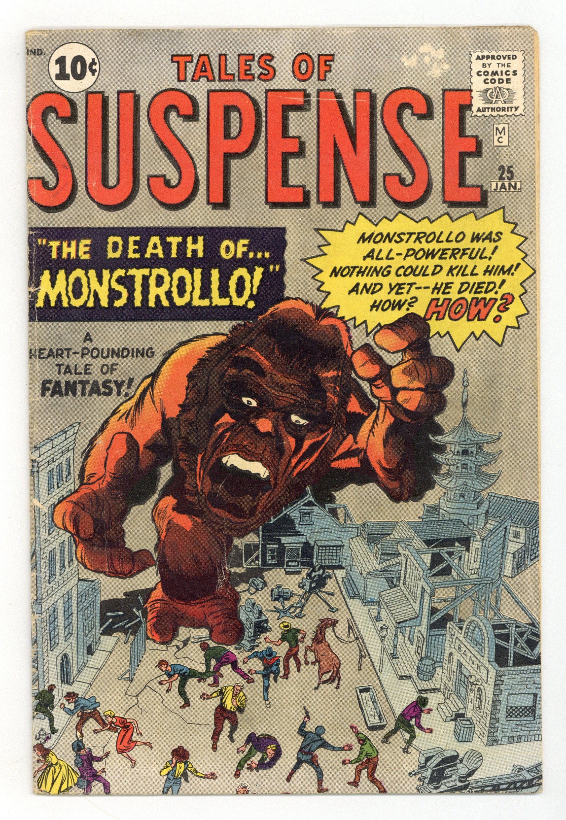 Last 10-cent issue. Cover pencils by Jack Kirby, inks by George Klein. "The Death of Monstrollo," pencils by Jack Kirby, inks by Dick Ayers; A movie producer's next film is a sci-fi picture featuring a giant robotic monster; Bad press convinces him to abandon the project but just as he's about to disassemble the robot, an alien invasion fleet lands; He sends the robot lumbering towards them and they ineffectively fire their nerve weapons at it. "The Heat's On," art by Don Heck; When a young boy builds a fan to help his family get through a heat wave it brings down the flying saucer that caused the heat. "The Unseen," pencils by Jack Kirby, inks by George Klein; A scientist is contacted by a communist agent who offers him a million dollars for research into an invisibility ray; The man's greed makes him accept treason and he succeeds, but he finds that after testing the ray upon himself, he has become intangible as well and has no way of turning on the switch of the antidote ray. "The Hidden Face," script by Stan Lee, art by Steve Ditko; An alien bigot attempts to preach hate by hiding his face under a hood; When he assaults one of the people he is defaming he flees the police to escape capture. "The Enchanted Paint," art by Paul Reinman; A greedy prince marries a dowager queen; He tries to use her sleepwalking to cause her death, but the portrait of her husband calls out to warn her, and ghostly hands push the prince to his death. 36 pgs., full color. $0.10. Cover price $0.10.