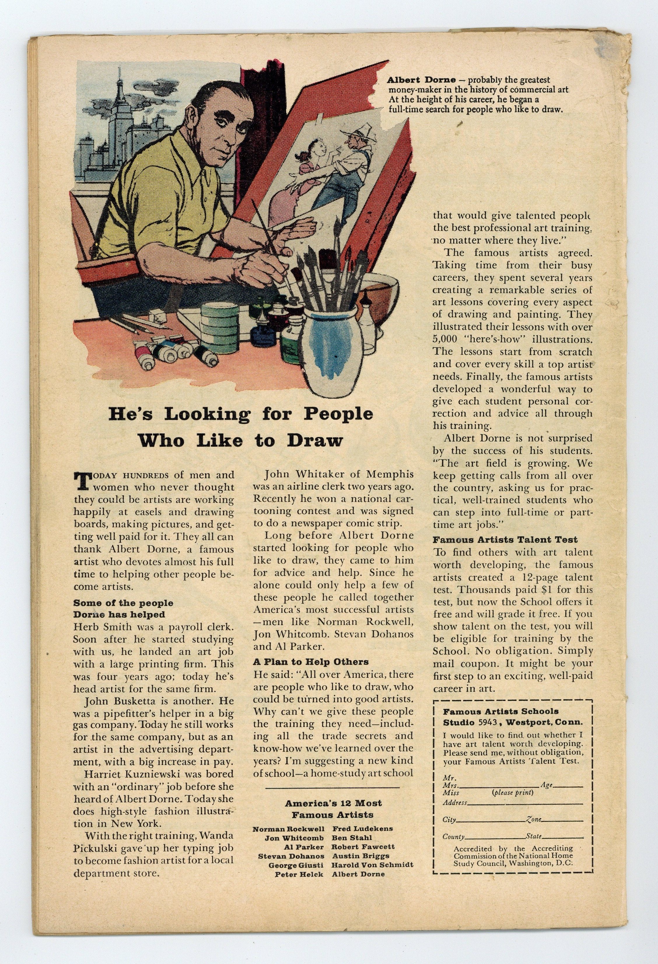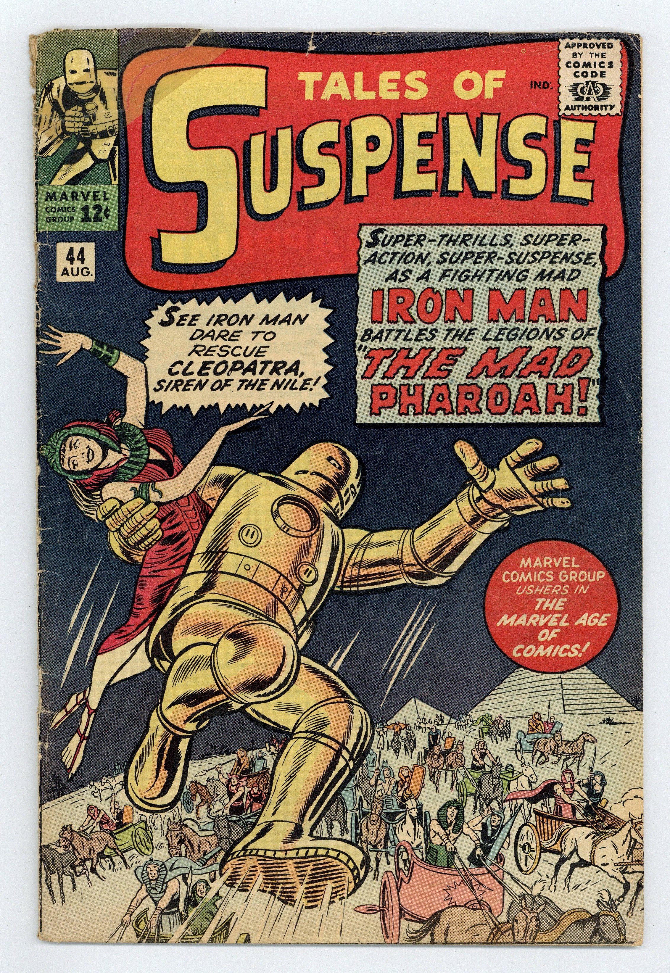 Cover pencils by Jack Kirby, inks by Dick Ayers. "The Mad Pharoah!", script by Stan Lee (plot) and Robert Bernstein (script) (as R. Bern), art by Don Heck; After waking up from a 2000 years long sleep, Hatap, the Mad Pharoah, brings Tony Stark into the past to resume his war against Cleopatra; Stark helps Cleopatra defeat Hatap as Iron Man. "The Tree" text story. "One of Us Must Die!", script by Stan Lee (plot) and Larry Lieber (script), pencils by Larry Lieber, inks by Paul Reinman; When a space passenger yacht is damaged, one of the passengers must be sacrificed for the others to survive; The captain lies in order to discover which is the most selfish and trick that person into making the sacrifice. "I Come From the Sky!", script by Stan Lee, art by Steve Ditko; A communist agent in Africa is supplying guns and explosives to tribesmen to encourage uprisings; When flying his plane to another group, he gets struck by lightning and ditches his plane near an unknown tribe; These natives are like the ones in King Kong who have built a huge wall to keep out some horrible beast. 36 pgs., full color. $0.12. Cover price $0.12.