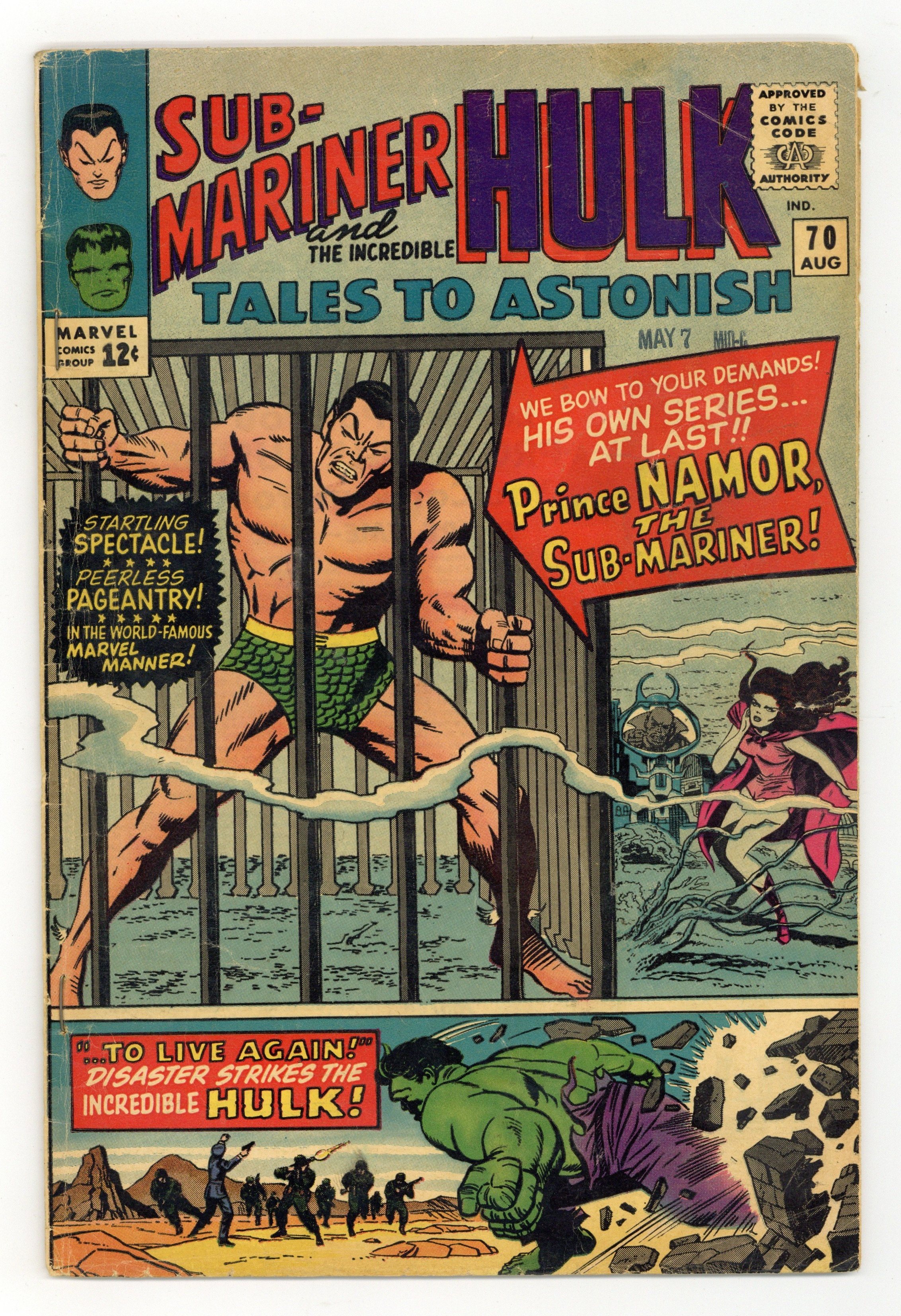 Cover by Jack Kirby and Mike Esposito. The Start of the Quest!, script by Stan Lee, art by Gene Colan (as Adam Austin) and Vince Colletta; Namor returns to Atlantis to find that Warlord Krang has taken his throne; When he spurns the affections of Lady Dorma, she turns him in and he is arrested by Krang as a traitor; Realizing that the only thing that will allow him to regain his kingdom and his subjects is the Trident of Neptune, Namor escapes to go and recover it. To Live Again!, script by Stan Lee, art by Jack Kirby and Mike Esposito (as Mickey Demeo); Dragging his dead buddy to their old underground complex, Rick uses the gamma machine (last seen in Incredible Hulk #6) on Bruce, thus turning him into the Hulk and saving his life; The Hulk once again has the intellect of Banner but he has to continue to use the ray machine every 48 hours to keep himself from turning into his alter ego as he still has a bullet lodged in his head. 36 pgs., full color. $0.12. Cover price $0.12.