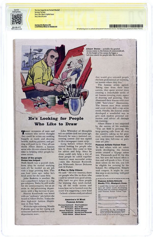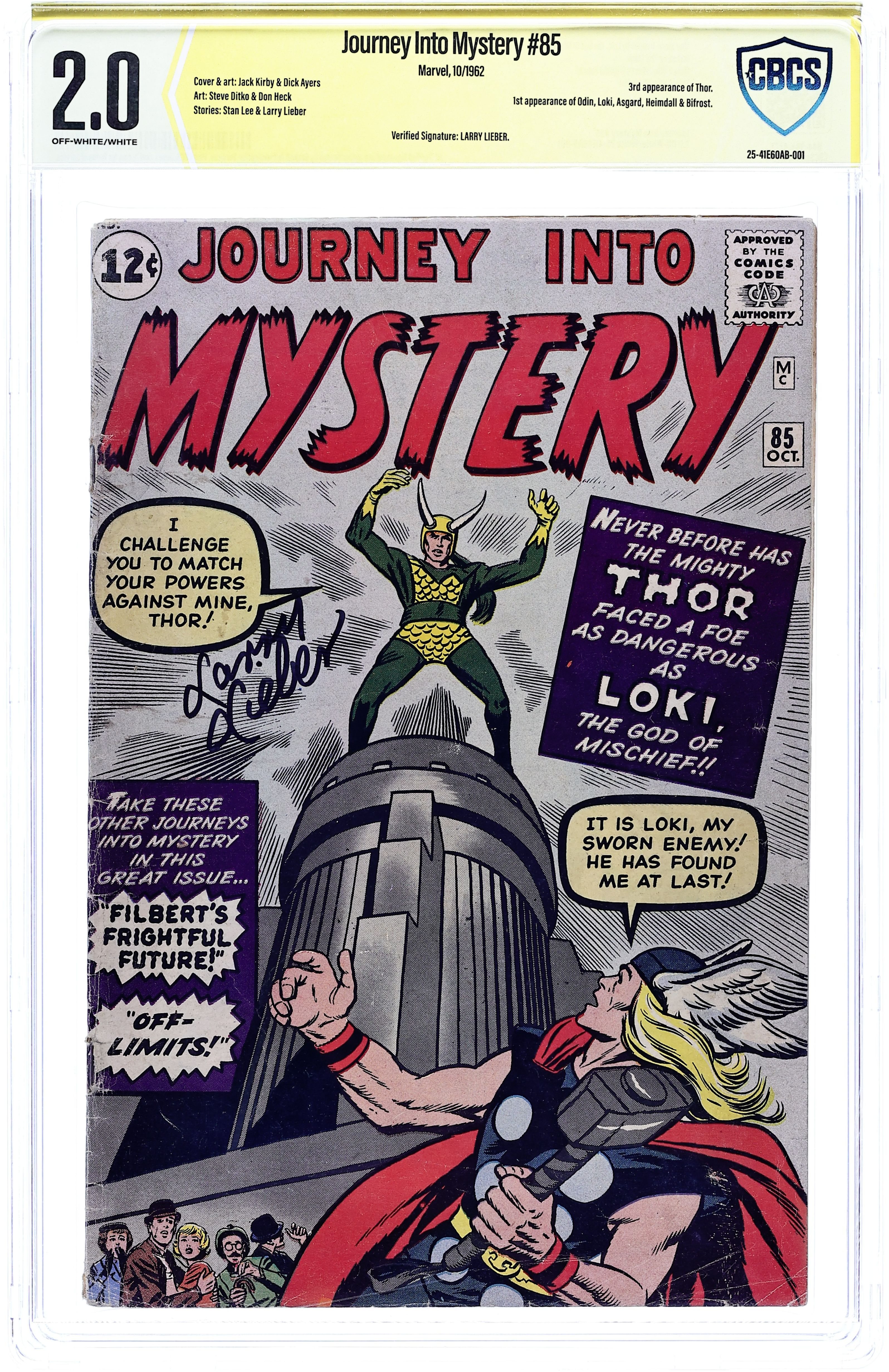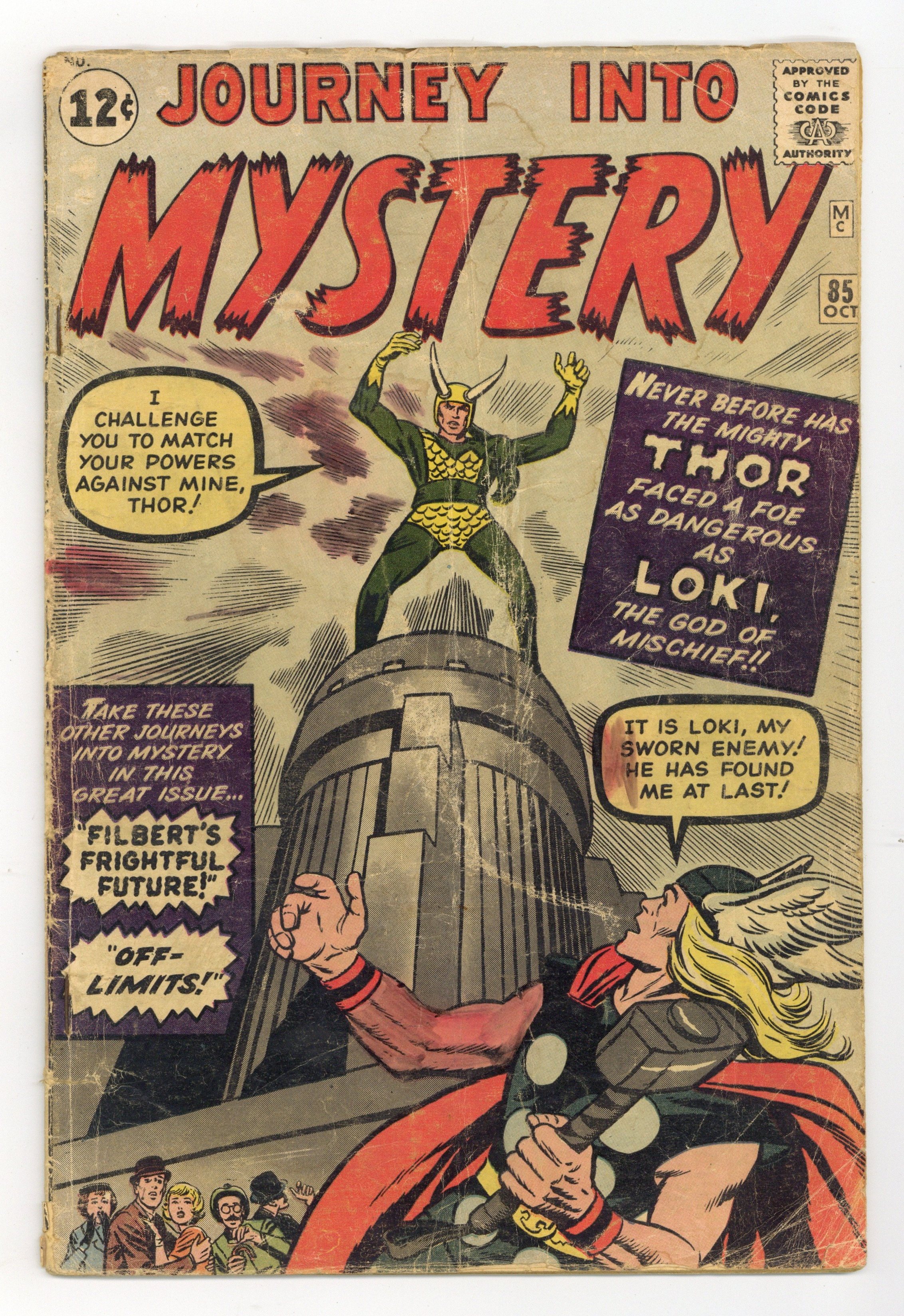 Cover pencils by Jack Kirby, inks by Dick Ayers. First appearance Loki and Heimdall, plus cameos of Odin, Balder, and Tyr, in "Trapped by Loki, the God of Mischief!", script by Stan Lee (plot) and Larry Lieber (script), pencils by Jack Kirby, inks by Dick Ayers; Loki escapes from his prison in Asgard and comes to Earth to get revenge on Thor; The trickster hypnotizes him to help make mischief. "The Clock" two-page text story. "Filbert's Frightful Future!", script by Stan Lee, art by Don Heck; A greedy scientist builds a time machine to visit the future and make money, but he finds himself stranded in a void, since the future does not yet exist. "Off-Limits!", script by Stan Lee, art by Steve Ditko; This story casts the character of Rip Van Winkle as a humanoid alien who visits planet Earth in violation of galactic travel guidelines which have declared the planet off limits. 36 pgs., full color. $0.12. Cover price $0.12.