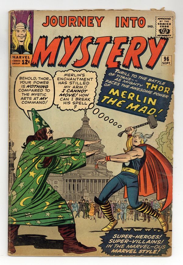 Ends Apr 27 9:45 PM CST Bid History 3 bids Current Bid $23 Your Secret Max Bid If you'd like to bid, please log in or register. Cover pencils by Jack Kirby, inks by Sol Brodsky. "Defying the Magic of... Mad Merlin!", script by Stan Lee (plot) and Robert Bernstein (script), art by Joe Sinnott; Merlin is awakened after a thousand years and immediately decides to try and take over the world; He battles Thor using familiar Washington D.C. monuments; Jane Foster appearance; Cameos by King Arthur and his knights, John F. Kennedy, Pierre Salinger, and Caroline Kennedy. The first half of a two-page text story, "The Traveler." "Call Her...Medusa!":, script by Stan Lee (plot) and Larry Lieber (script), pencils by Larry Lieber, inks by Paul Reinman; The gorgons of myth were aliens and send an agent to modern Earth preceding an invasion. "Frederick Fenton's Future!", script by Stan Lee, art by Steve Ditko; An arrogant rich man builds a time machine in order gain the secret to eternal life from the future. 36 pgs., full color. $0.12. Cover price $0.12.