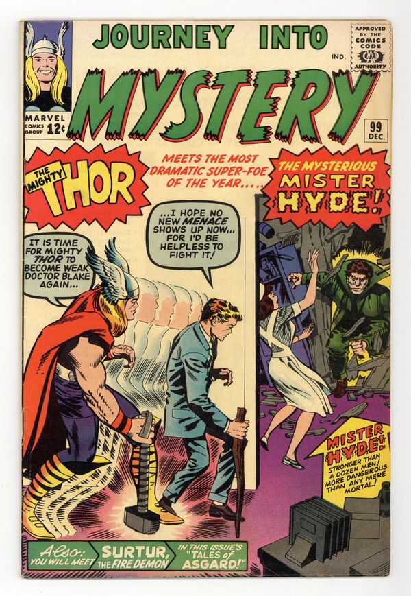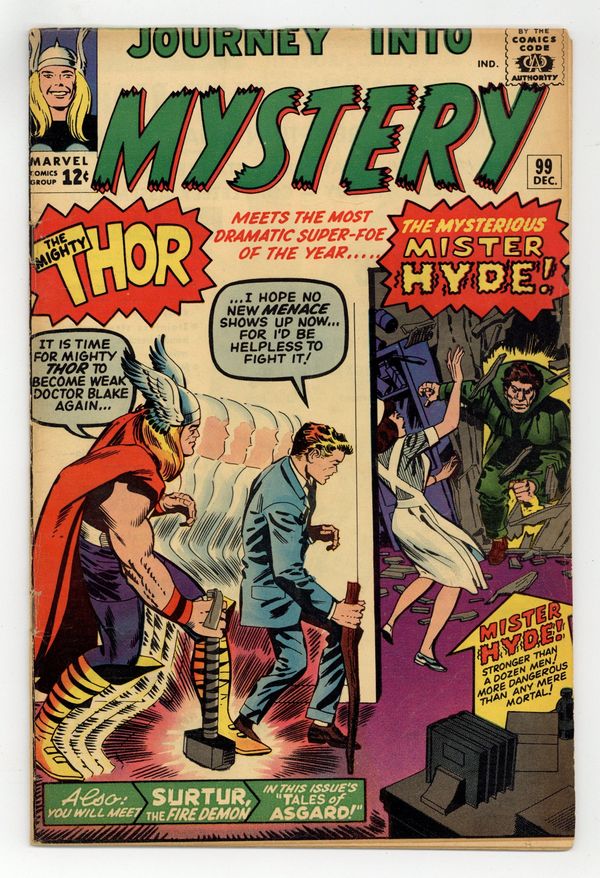 Cover pencils by Jack Kirby, inks by George Roussos. First appearance of Mr. Hyde in "The Mysterious Mister Hyde!", script by Stan Lee, art by Don Heck; Having been refused a job by Doctor Blake, Calvin Zabo becomes Mister Hyde and attacks the doctor; Meanwhile, Odin has agreed to let Thor marry Jane Foster if she proves worthy. "The Thread" text story. "Stroom's Strange Solution!", script by Stan Lee (plot) and Larry Lieber (script), pencils by Larry Lieber, inks by Matt Fox; An alien world is dangerously overpopulated, so a scientist releases a gas that shrinks the entire population, making the same amount of space accommodate more people. Third "Tales of Asgard" installment, "Surtur the Fire Demon!, script by Stan Lee, pencils by Jack Kirby, inks by George Roussos; The Trolls ally with Surtur against Asgard, but Odin conquers them; Surtur travels to Earth to destroy it. 36 pgs., full color. $0.12. Cover price $0.12.