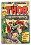 Cover pencils by Jack Kirby, inks by Chic Stone. Thor just can't catch a break--he faces Loki, the Cobra, and Mr. Hyde in "Every Hand Against Him!", script by Stan Lee, pencils by Jack Kirby, inks by Chic Stone; Loki sends the Cobra and Mr. Hyde to kidnap Jane; Thor confronts them but is forced to back down and let them go after they threaten to hurt her; Odin, witnessing the scene, expresses his displeasure at Thor's "weakness" and banishes him from Asgard; Thor explains that his former actions were a result of Loki's trickery; Odin allows Thor to return to Earth where he battles the villains again; He rescues Jane but she is critically ill; Whirling his hammer, Thor creates a vortex around Jane in which time stands still; This will afford him the opportunity to finish his battle with Cobra and Hyde; Appearances by Jane Foster and Heimdall. Marvel Masterwork Pin-Up of Thor, pencils by Jack Kirby, inks by Chic Stone. "Tales of Asgard" back-up, "The Defeat of Odin!" Script by Lee, pencils by Kirby, inks by Vince Colletta; Was Odin defeated by an army of men, or did he stage the battle to teach the gods a lesson? The revelation of what M.M.M.S. stands for. 36 pgs., full color. Cover price $0.12.