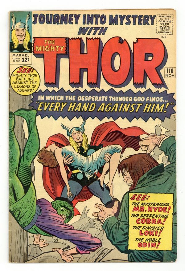 Tags: Marvel Legacy Numbering: Thor (part 110), Thor$45.50Cover pencils by Jack Kirby, inks by Chic Stone. Thor just can't catch a break--he faces Loki, the Cobra, and Mr. Hyde in "Every Hand Against Him!", script by Stan Lee, pencils by Jack Kirby, inks by Chic Stone; Loki sends the Cobra and Mr. Hyde to kidnap Jane; Thor confronts them but is forced to back down and let them go after they threaten to hurt her; Odin, witnessing the scene, expresses his displeasure at Thor's "weakness" and banishes him from Asgard; Thor explains that his former actions were a result of Loki's trickery; Odin allows Thor to return to Earth where he battles the villains again; He rescues Jane but she is critically ill; Whirling his hammer, Thor creates a vortex around Jane in which time stands still; This will afford him the opportunity to finish his battle with Cobra and Hyde; Appearances by Jane Foster and Heimdall. Marvel Masterwork Pin-Up of Thor, pencils by Jack Kirby, inks by Chic Stone. "Tales of Asgard" back-up, "The Defeat of Odin!" Script by Lee, pencils by Kirby, inks by Vince Colletta; Was Odin defeated by an army of men, or did he stage the battle to teach the gods a lesson? The revelation of what M.M.M.S. stands for. 36 pgs., full color. Cover price $0.12.