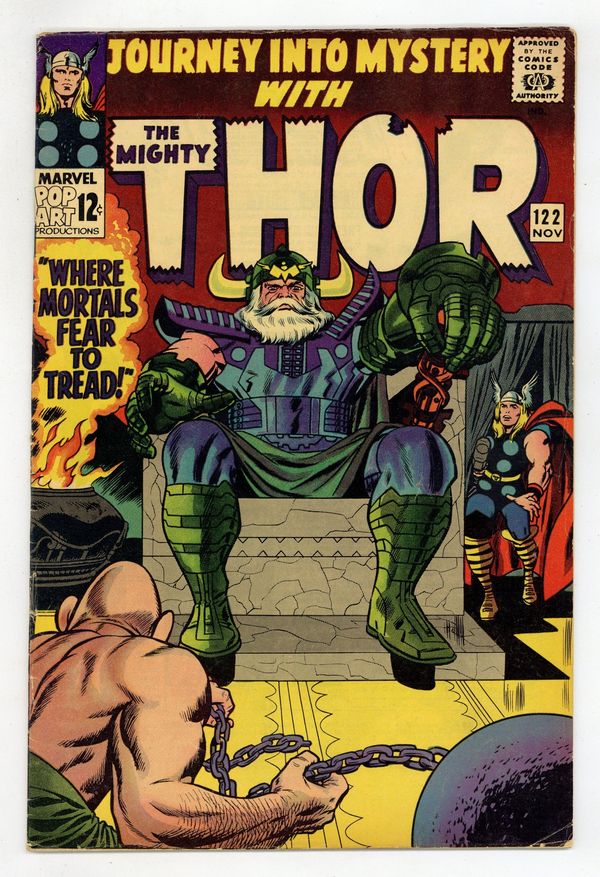 Tags: Marvel Legacy Numbering: Thor (part 122), Thor$39.00Cover pencils by Jack Kirby, inks by Wally Wood. "Where Mortals Fear To Tread!", script by Stan Lee, pencils by Jack Kirby, inks by Vince Colletta; Loki transports The Absorbing Man to Asgard to challenge the power of Odin while Thor rescues Jane from captivity, and addresses a threat to his secret identity from a reporter. Tale of Asgard: "The Grim Specter of Mutiny!", script by Stan Lee, pencils by Jack Kirby, inks by Vince Colletta; Loki foments a mutiny aboard the ship Thor captains to save Asgard itself. Hogun, Fandral, Volstagg, and Balder appearances. 36 pgs., full color. $0.12. Cover price $0.12.