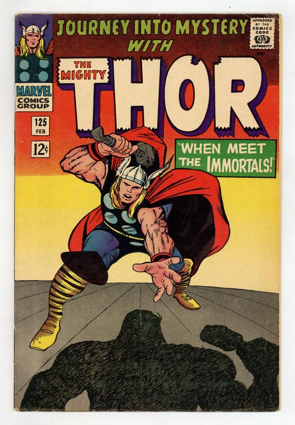 Cover pencils by Jack Kirby, inks by Vince Colletta. "When Meet the Immortals!", script by Stan Lee, pencils by Jack Kirby, inks by Vince Colletta; Thor grapples with "The Demon" to recover the Norn Stone, while Hercules blunders about the world of Man, crossing paths with Jane Foster. Marvel Bullpen Bulletins. Tale of Asgard: "The Queen Commands," script by Stan Lee, pencils by Jack Kirby, inks by Vince Colletta; Thor's plans for a peaceful parlay with the Flying Trolls is dashed when Loki unleashes a poison gas on them! Ad for Hulk Sweat Shirt, Spider-Man Pin-Up, Super-Hero Stationery Kit, and Thor T-Shirt. 36 pgs., full color. $0.12. Cover price $0.12.
