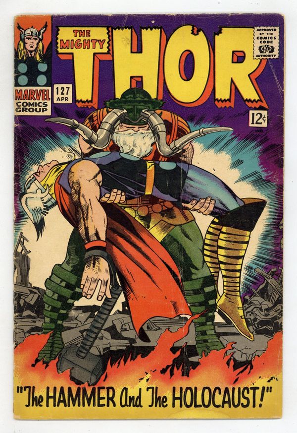 Cover pencils by Jack Kirby, inks by Vince Colletta. Pluto (from Red Raven Comics #1, August 1940) is reintroduced in "The Hammer and the Holocaust!", script by Stan Lee, pencils by Jack Kirby, inks by Vince Colletta; The weakened and defeated Thor returns to Asgard where he finds Seidring has taken over; He battles the 'odin power' and defeats Seidring only to collapse himself. Appearances by Odin, Hercules, Jane Foster, Balder, and Heimdall. Marvel Bullpen Bulletins. Tale of Asgard: "The Meaning of... Ragnarok", script by Stan Lee, pencils by Jack Kirby, inks by Vince Colletta; The Asgardian gods have returned to Asgard where the prophetess Vollo relates the coming of Ragnarok! Odin and Balder appearances; Heimdall and Fandral cameos. 36 pgs., full color. $0.12. Cover price $0.12.