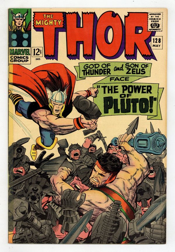 Cover pencils by Jack Kirby, inks by Vince Colletta. "The Power of Pluto!", script by Stan Lee, pencils by Jack Kirby, inks by Vince Colletta; Thor recovers from his injuries last issue and goes looking for a rematch with Hercules who has been tricked into signing a contract with Pluto. Appearances by Odin, Balder, and Volstagg. Tale of Asgard: "Aftermath!", script by Stan Lee, pencils by Jack Kirby, inks by Vince Colletta; The Asgardian gods deliberate over the coming of Ragnarok. Appearance by Odin; cameos by Balder, Hogun, Fandral, and Volstagg. 36 pgs., full color. $0.12. Cover price $0.12.