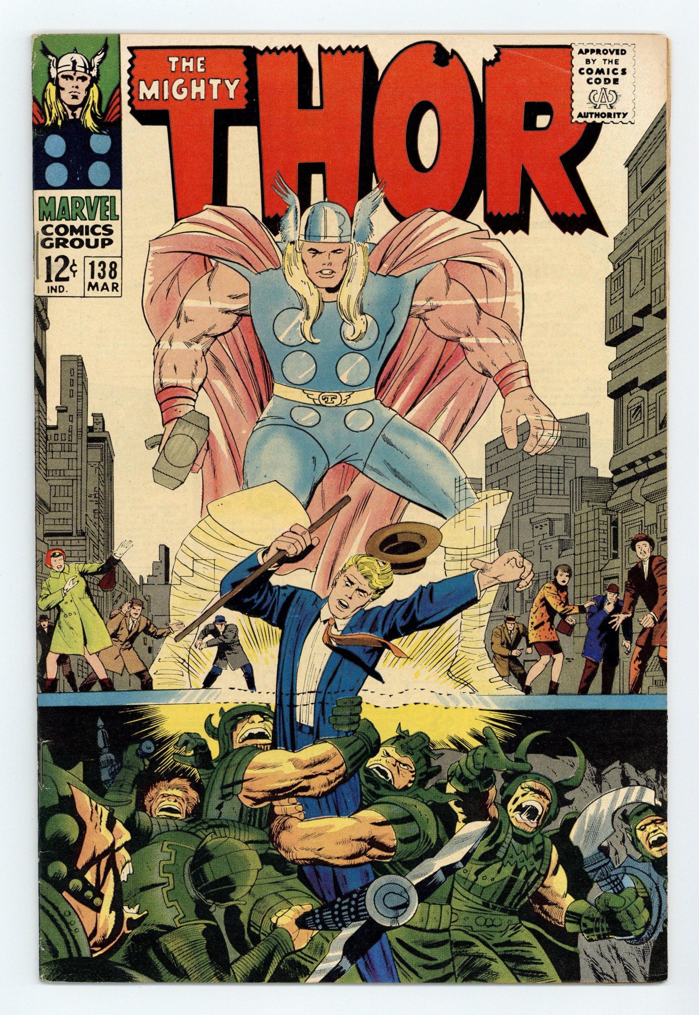 Cover pencils by Jack Kirby, inks by Vince Colletta. "The Flames of Battle!", script by Stan Lee, pencils by Jack Kirby, inks by Vince Colletta; The Trolls steal Thor's hammer while he's on earth using the Orb of Orikal which they have stolen from its owner. Appearances by Sif, Odin, and Ulik. Tale of Asgard: "The Quest for the Mystic Mountain!", script by Stan Lee, pencils by Jack Kirby, inks by Vince Colletta; Thor and companions defeat the one-eyed Ogur to speak with Wazir, the prophet. 36 pgs., full color. $0.12. Cover price $0.12.