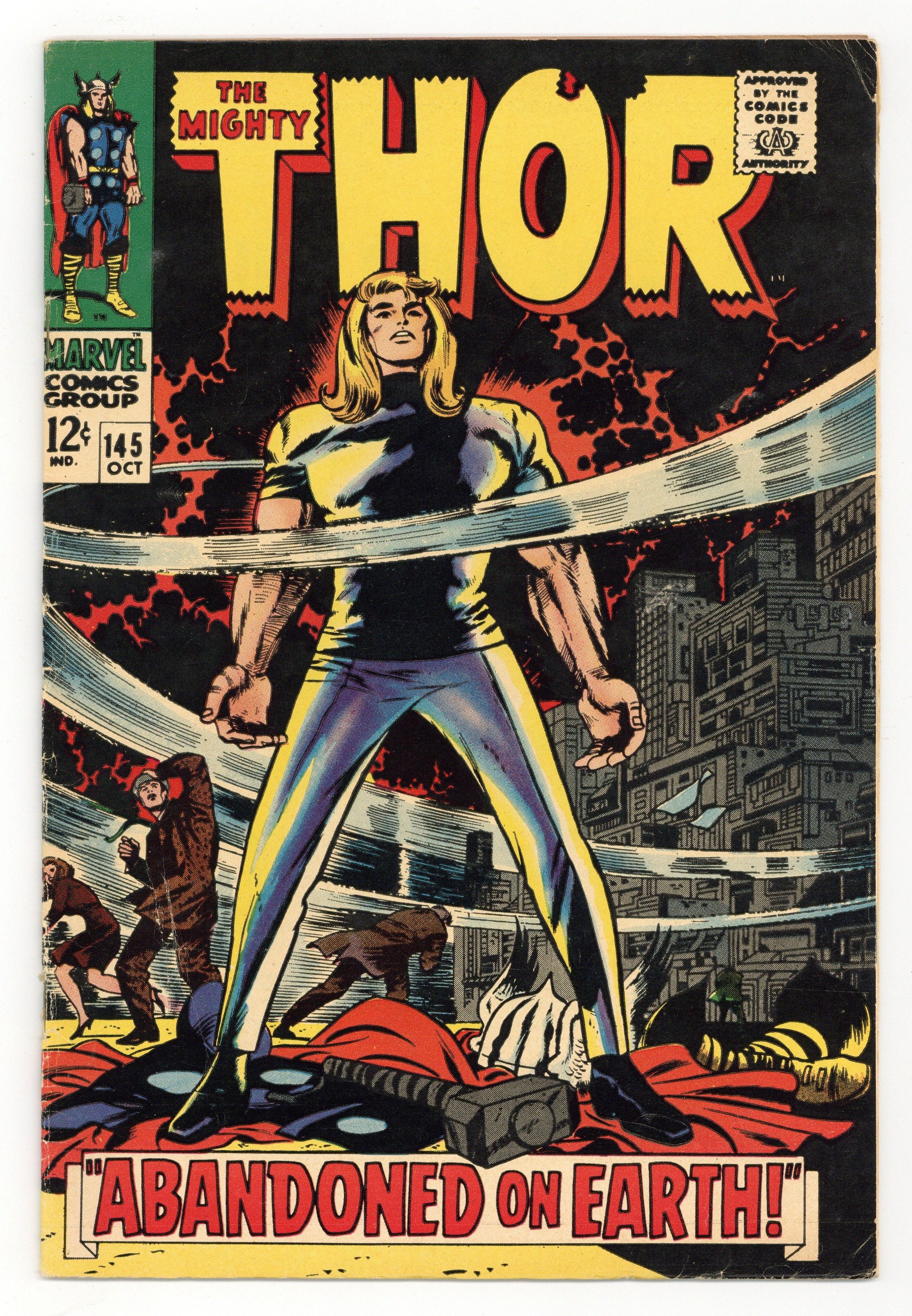 Tags: Marvel Legacy Numbering: Thor (part 145), Thor$12.00Cover pencils by Jack Kirby and John Romita (alterations), inks by Vince Colletta and John Romita (alterations). "Abandoned on Earth!", script by Stan Lee, pencils by Jack Kirby, inks by Vince Colletta; Odin defeats Forsung and demands all Asgardians return; Thor refuses and his powers are removed (except Asgardian Strength); The Ringmaster hypnotizes Thor into joining the Circus of Crime. Appearances by Balder, Sif, Odin, and the Circus of Crime. Tale of Asgard: "The End!", script by Stan Lee, pencils by Jack Kirby, inks by Vince Colletta; Alibar and Hogun defeat Mogul's spotted plague. 36 pgs., full color. $0.12. Cover price $0.12.