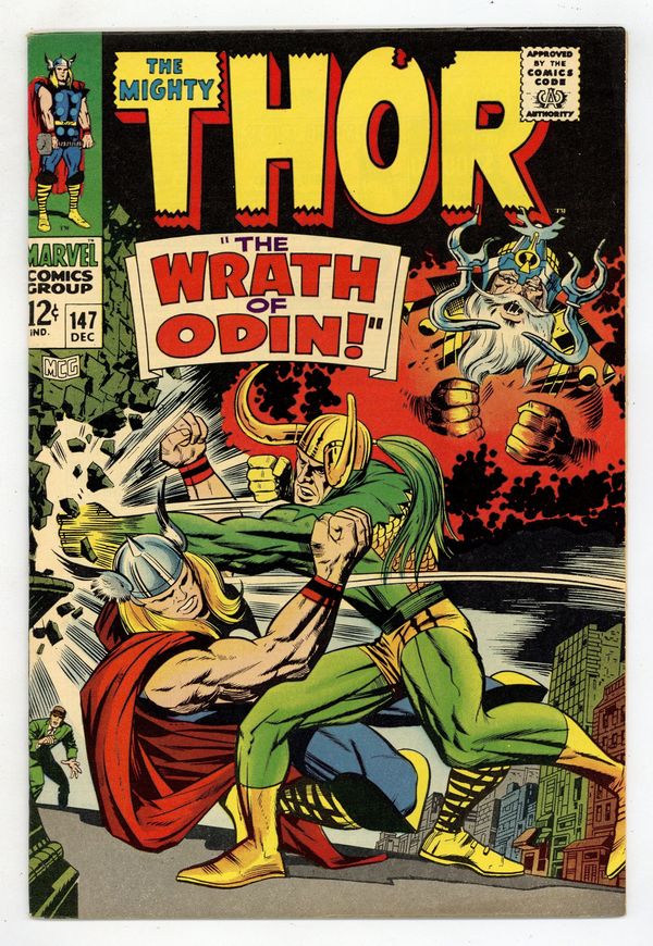 Tags: Marvel Legacy Numbering: Thor (part 147), Thor$25.00Cover pencils by Jack Kirby, inks by Vince Colletta. "The Wrath of Odin!", script by Stan Lee, pencils by Jack Kirby, inks by Vince Colletta; Thor surrenders to the police, Loki posts his bail and attacks him when alone; Sif and Balder intervene. Appearances by Odin and the Circus of Crime. Origins of the Inhumans back-up: "The Reason Why!", script by Stan Lee, pencils by Jack Kirby, inks by Joe Sinnott; King Randac gains evergy powers from the Terrigen Mists and decrees that all of his subjects will be exposed to the Mists; The Sentry reveals that the Kree were responsible for the advanced scientific knowledge of Randac's people. 36 pgs., full color. $0.12. Cover price $0.12.