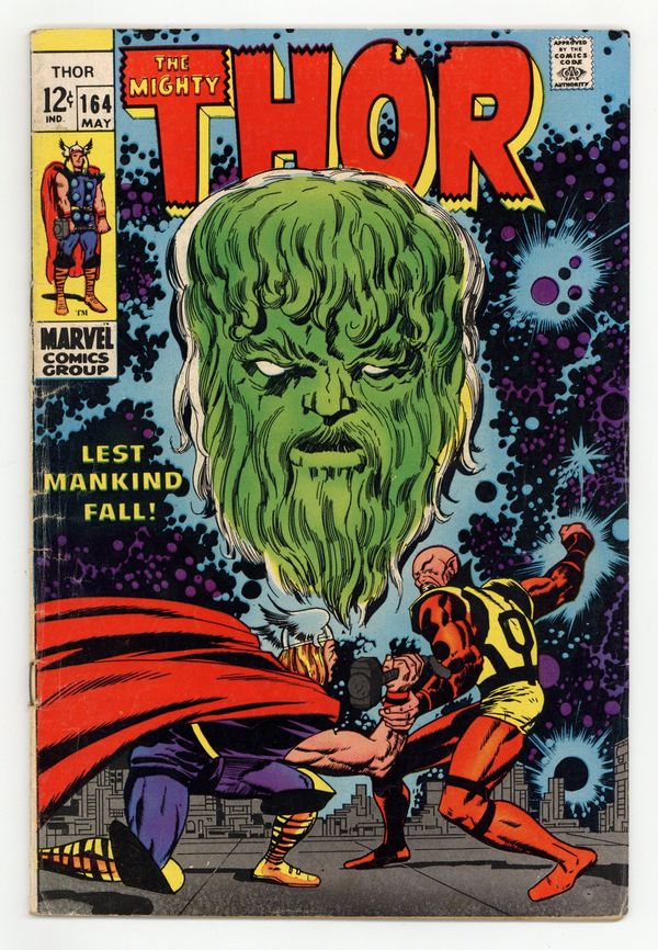 Tags: Marvel Legacy Numbering: Thor (part 164), Thor$18.25Cover pencils by Jack Kirby, inks by Vince Colletta. "Lest Mankind Fall!", script by Stan Lee, pencils by Jack Kirby, inks by Vince Colletta; Trapped in an apocalyptic future with Pluto, God of Death, Sif and Thor find themselves in dire need of back-up; In true god-like fashion, Zeus makes his sweeping entrance; Is the King of the Gods here to support the Asgardians, or Pluto?; Back on Asgard, Balder continues to struggle with stray thoughts of Karnilla, the Norn Queen. Appearances by Balder, Sif, Karnilla, Zeus, and Odin. Re-introduction of Athena (from Red Raven Comics 1, August 1940). Adam Warlock (still in cocoon) cameo. 36 pgs., full color. $0.12. Cover price $0.12.