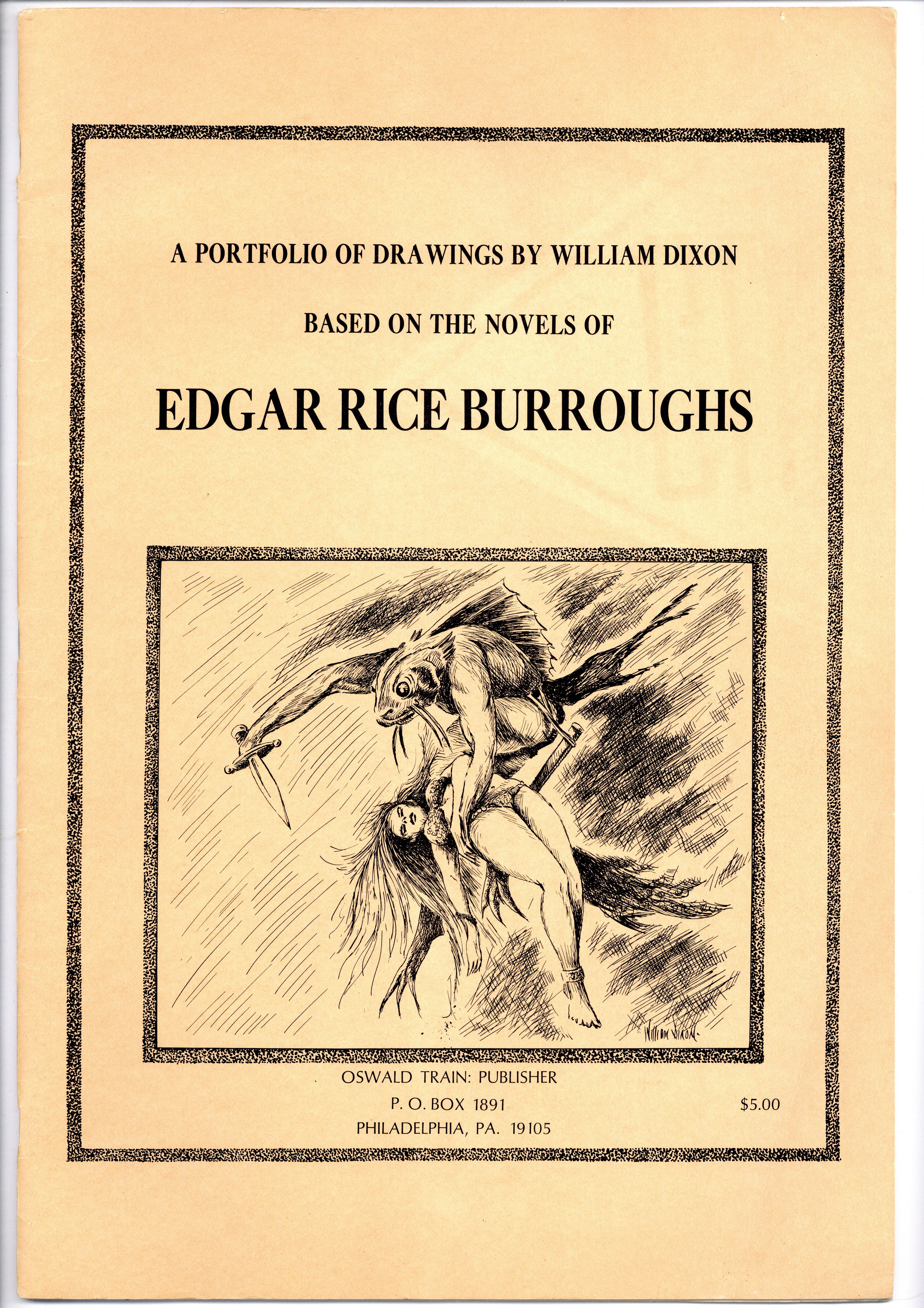 Portfolio format containing 10 numbered and bound plates by William Dixon. Published by Oswald Train, co-founder of small press science fiction publisher, Prime Press. Images include Dejah Thoris, Tarzan, Ras Thavas, La of Opar, and others. Also with a frontispiece pencil portrait of ERB by Dixon and an informational page about ERB and each plate. 11.25" x 16.25" Black and white. Cover price $5.00.