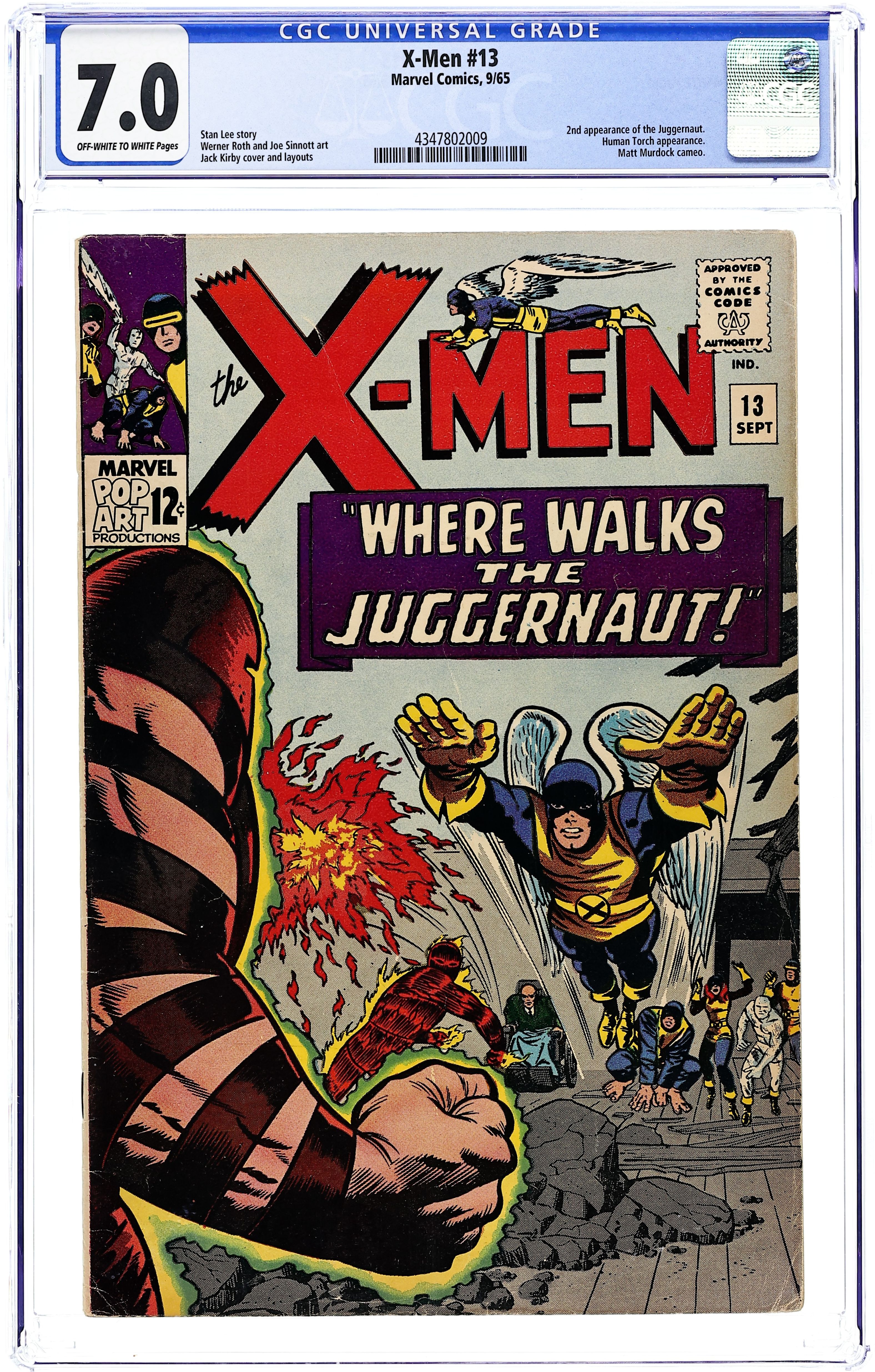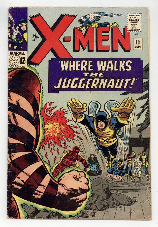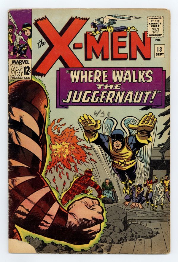 Cover pencils by Jack Kirby, inks by Joe Sinnott. Where Walks the Juggernaut!, script by Stan Lee, pencils by Jack Kirby (layouts) and Werner Roth [as Jay Gavin], inks by Joe Sinnott; Juggernaut has invaded the mansion and the X-Men struggle to take down Xavier's unstoppable half-brother; Human Torch lends a hand and Professor X is able to bring his brother down. 36 pgs. $0.12. Cover price $0.12.
