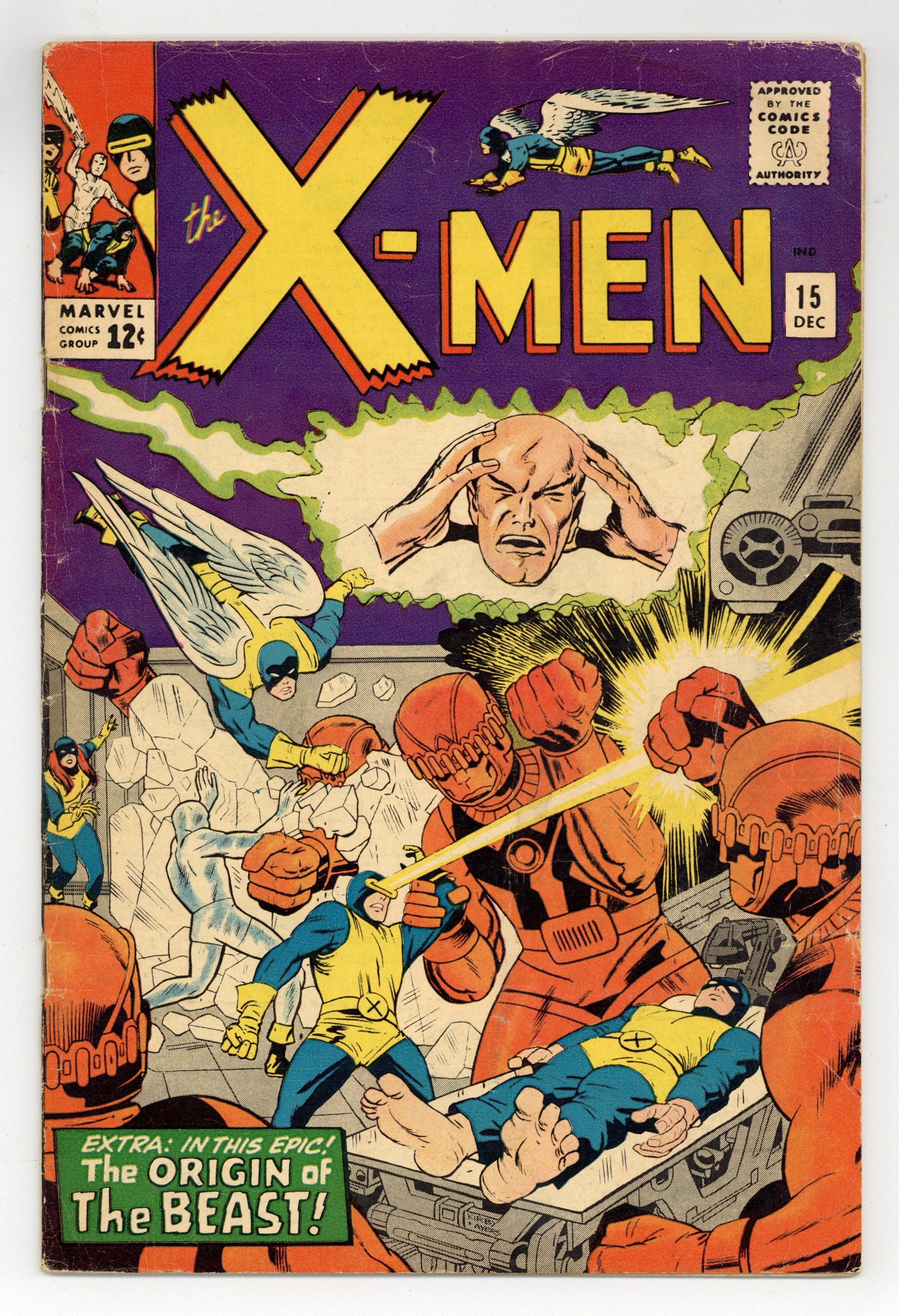 The origin of the Beast. Cover pencils by Jack Kirby, inks by Dick Ayers. Prisoners of the Mysterious Master Mold!, script by Stan Lee, pencils by Jack Kirby (layouts) and Werner Roth [as Jay Gavin] (pencils), inks by Dick Ayers; The X-Men invade the Sentinel's underground complex but are captured; Beast is taken before the Sentinel's leader, Master Mold, and has his mind probed; Master Mold commands Trask to make an army of Sentinels so they can take over the world. 36 pgs. $0.12. Cover price $0.12.