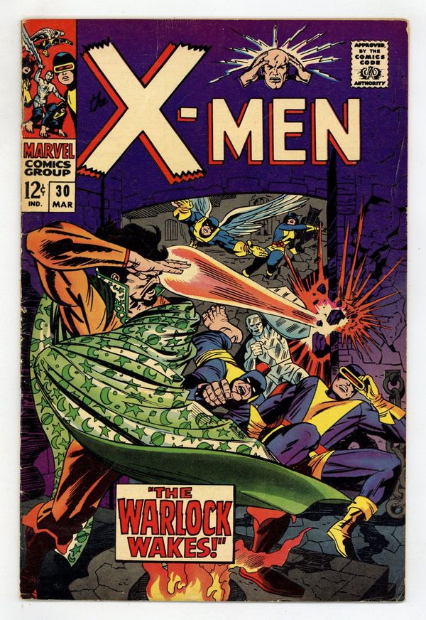 Cover pencils by Jack Kirby. The Warlock Wakes!, script by Roy Thomas, pencils by Jack Sparling, inks by John Tartaglione; the X-Men battle Warlock, who reveals that he used to be Merlin the Magician;Thor cameo. This issue contains a statement of ownership--average print run 412,086; average paid circulation 255,070.36 pgs. $0.12. Cover price $0.12.