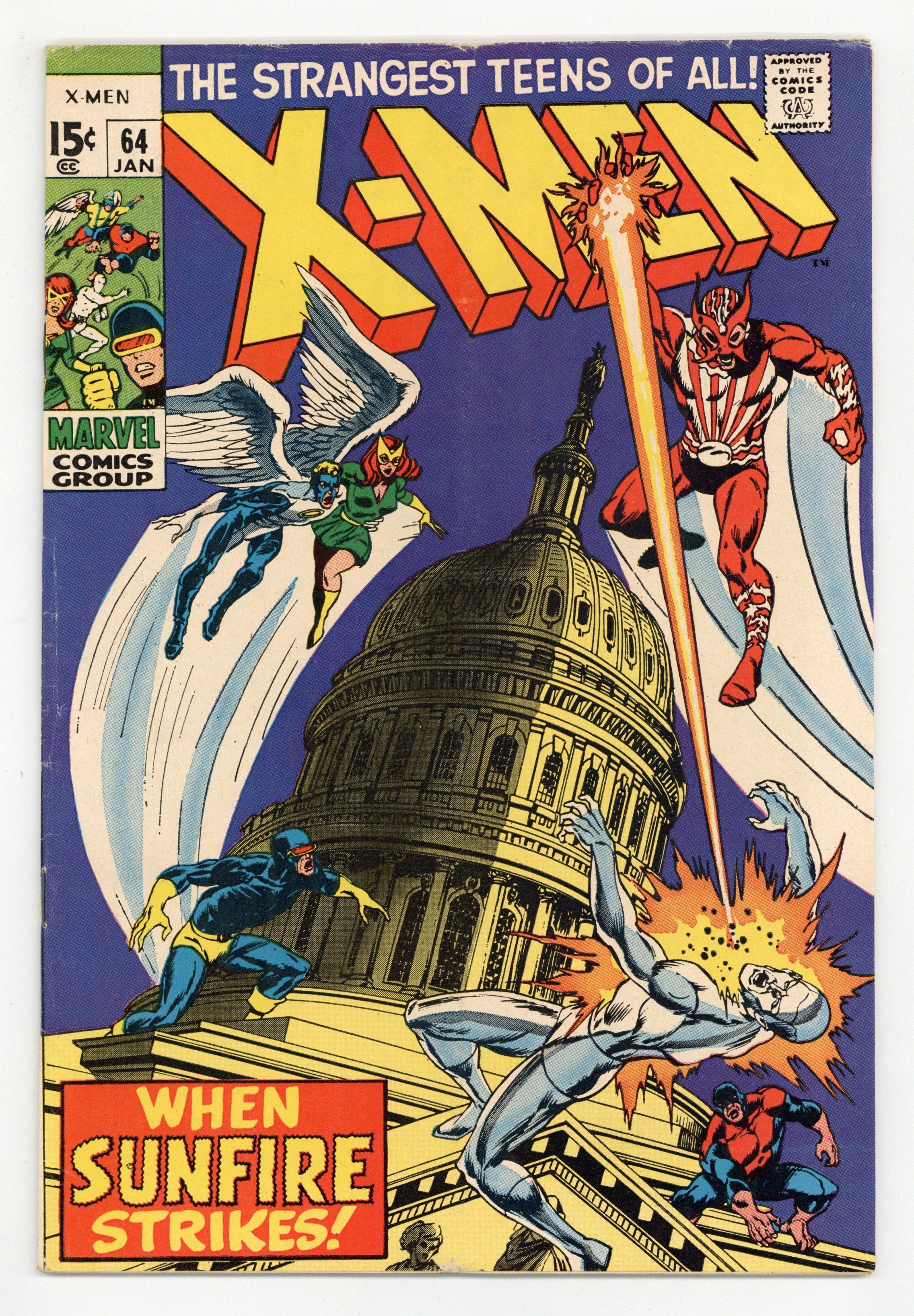 First appearance of Sunfire. Sal Buscema cover pencils, cover inks by Tom Palmer. The Coming of Sunfire!, script by Roy Thomas, pencils by Don Heck, inks by Tom Palmer; Iceman, Beast, and Angel battle Sunfire, who destroys a monument in New York City; Sunfire, who talks to his uncle about Hiroshima, wants to destroy the Capitol in Washington, DC. The letters page also reveals that acclaimed author Daniel Keyes ("Flowers for Algernon") once did some editorial work for Marvel! 36 pgs. $0.15. Cover price $0.15.
